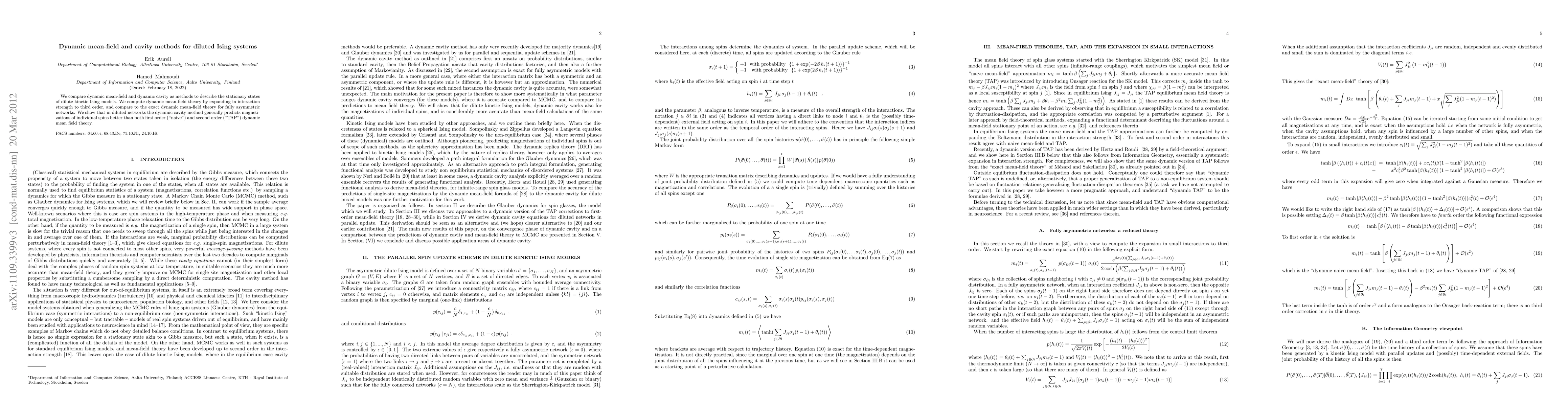 We compare dynamic mean-field and dynamic cavity as methods to describe the stationary states of dilute kinetic Ising models. We compute dynamic mean-field theory by expanding in interaction strength to third order, and compare to the exact dynamic mean-field theory for fully asymmetric networks. We show that in diluted networks the dynamic cavity method generally predicts magnetizations of individual spins better than both first order ("naive") and second order ("TAP") dynamic mean field theory.