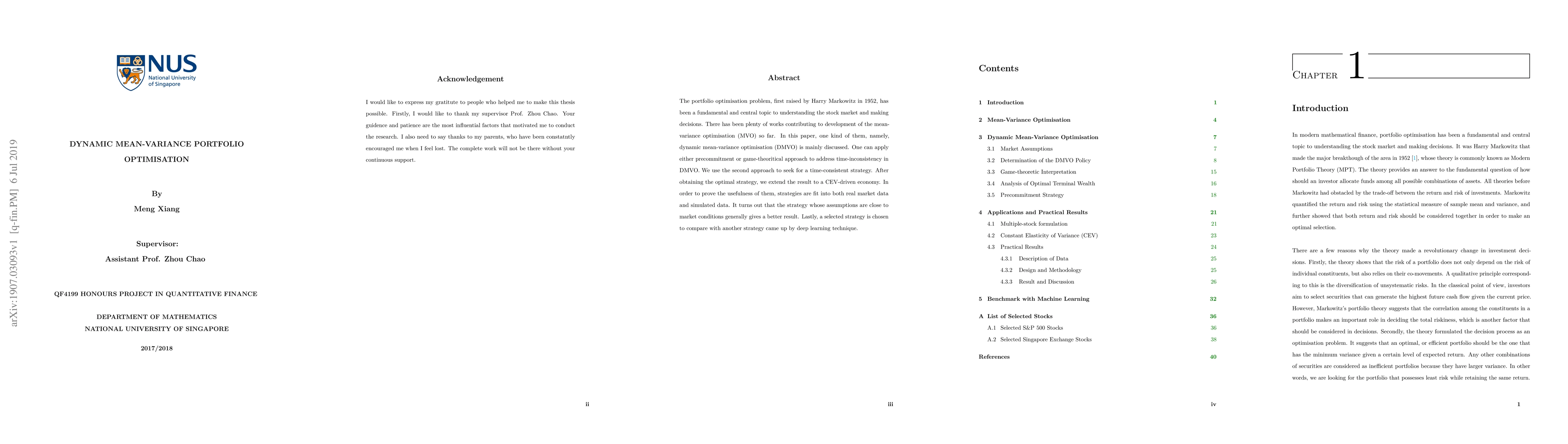 The portfolio optimisation problem, first raised by Harry Markowitz in 1952, has been a fundamental and central topic to understanding the stock market and making decisions. There has been plenty of works contributing to development of the mean-variance optimisation (MVO) so far. In this paper, one kind of them, namely, dynamic mean-variance optimisation (DMVO) is mainly discussed. One can apply either precommitment or game-theoritical approach to address time-inconsistency in DMVO. We use the second approach to seek for a time-consistent strategy. After obtaining the optimal strategy, we extend the result to a CEV-driven economy. In order to prove the usefulness of them, strategies are fit into both real market data and simulated data. It turns out that the strategy whose assumptions are close to market conditions generally gives a better result. Lastly, a selected strategy is chosen to compare with another strategy came up by deep learning technique.