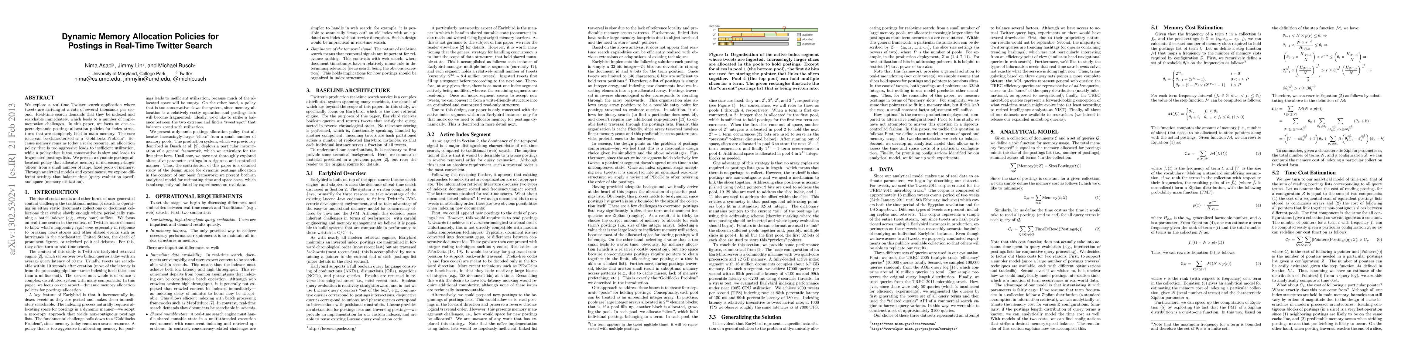 A new dynamic memory allocation policy is presented to balance query evaluation speed and memory utilization in a real-time Twitter search application, addressing the challenge of allocating resources efficiently without sacrificing performance or space.