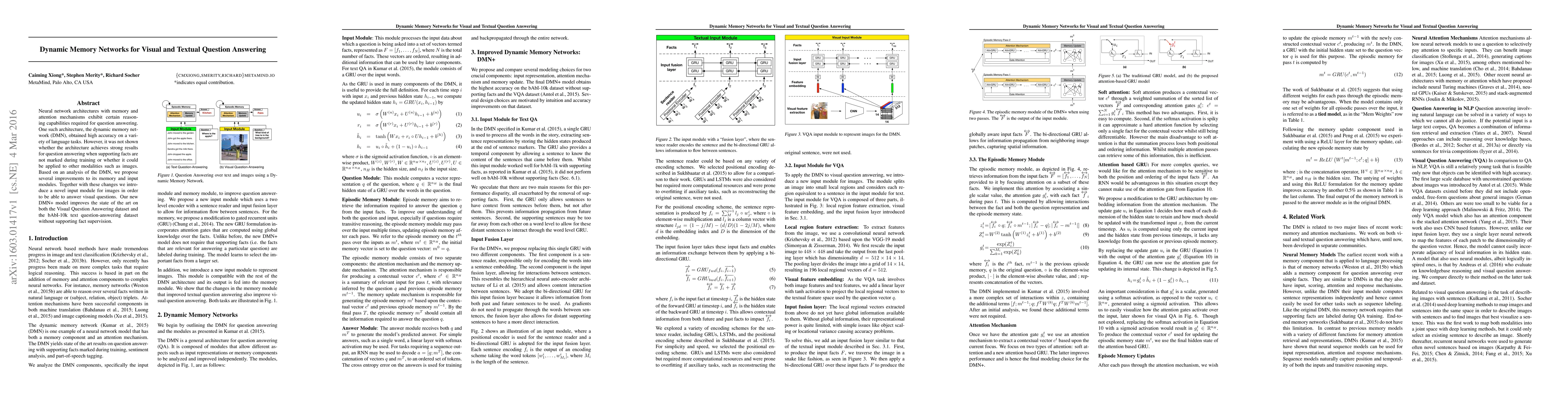 The paper proposes enhancements to the dynamic memory network (DMN) to improve its performance in visual and textual question answering, introducing a new input module for images and achieving state-of-the-art results on both Visual Question Answering and \babi-10k datasets without requiring supporting fact supervision during training.