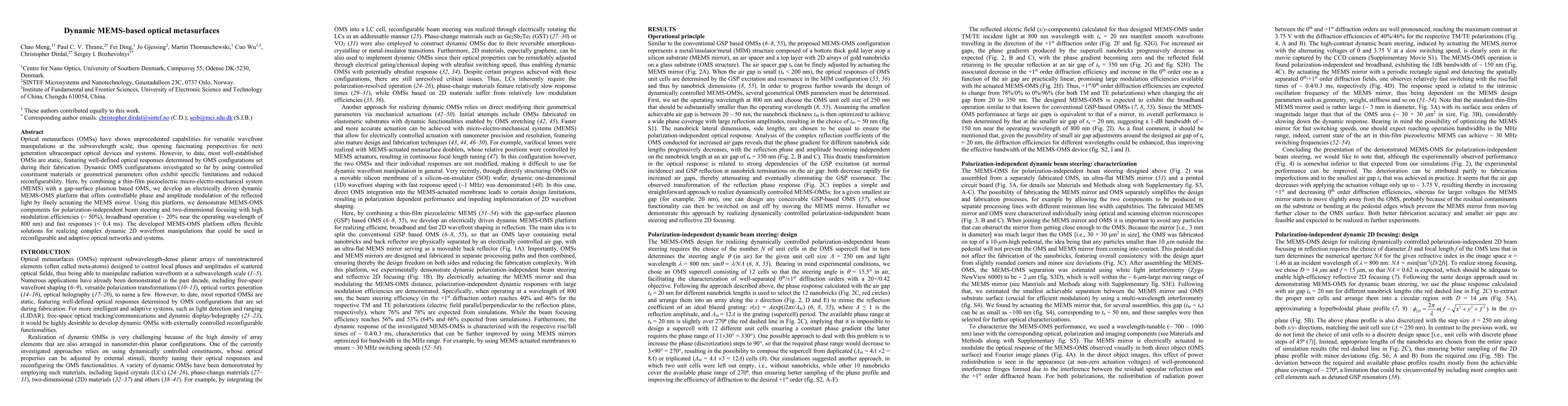 This paper presents a dynamic MEMS-based optical metasurface platform that enables controllable phase and amplitude modulation through piezoelectric MEMS mirrors, demonstrating high efficiency, broadband operation, and fast response for applications in reconfigurable optical networks and systems.