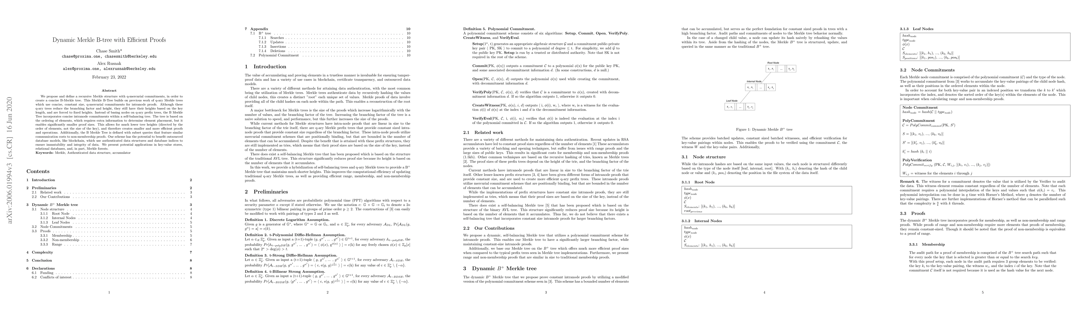 This paper proposes a dynamic B-Merkle tree using q-mercurial commitments for concise intranode proofs, achieving smaller proof sizes and lower tree heights compared to traditional q-ary Merkle trees. It aims to improve efficiency in outsourced database models, key-value stores, and relational databases.