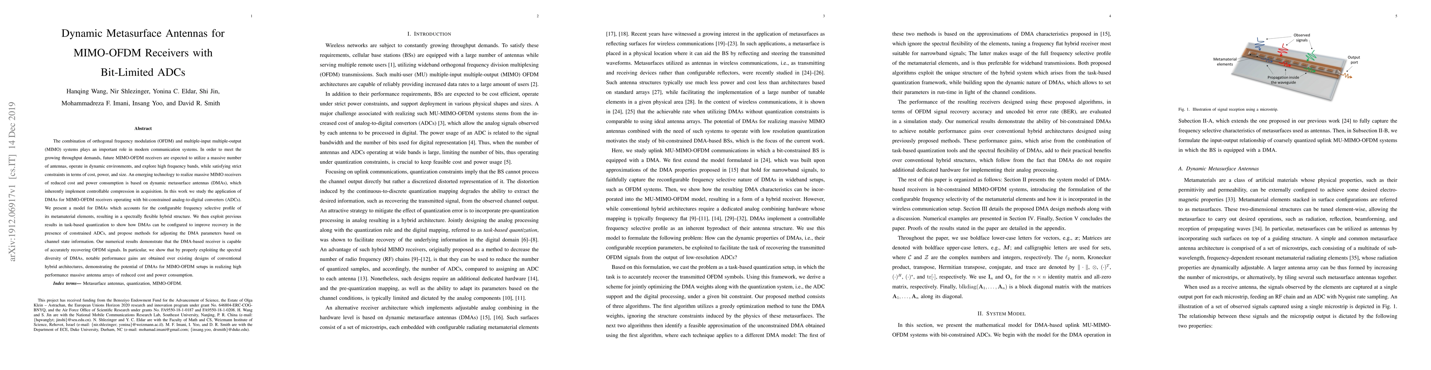 The paper proposes a model for dynamic metasurface antennas (DMAs) for MIMO-OFDM receivers with bit-limited ADCs, formulating the OFDM recovery problem as a task-based quantization setup. An iterative algorithm is derived for setting DMA weights, ignoring structure constraints, to minimize MSE in recovering transmitted signals by sequentially adapting each microstrip.