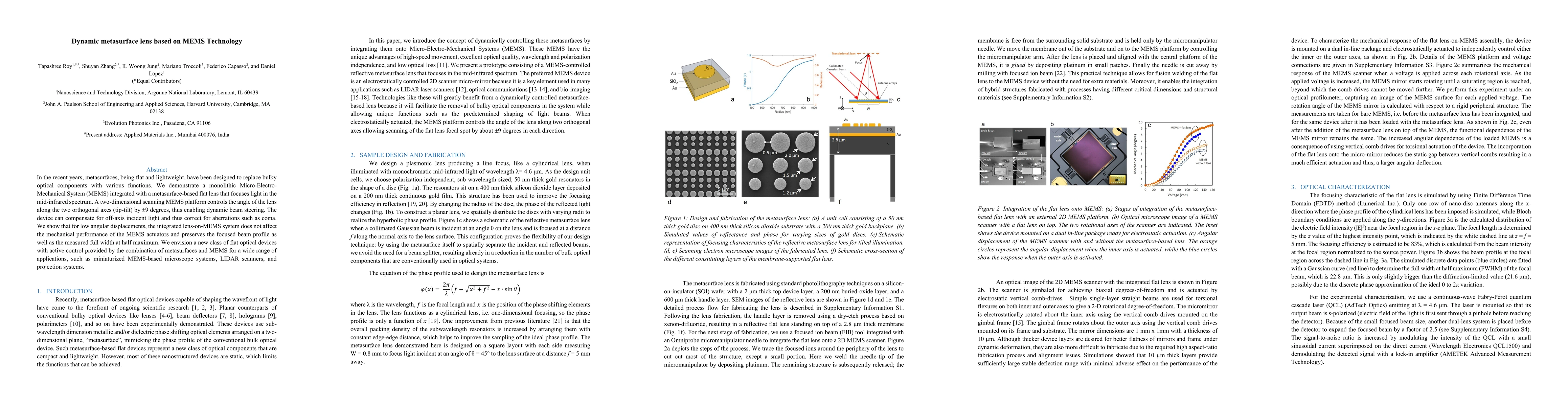 This paper presents a dynamic metasurface lens integrated with MEMS technology that focuses mid-infrared light and enables two-dimensional beam steering. The device compensates for off-axis light and aberrations, maintaining performance and beam quality, with potential applications in miniaturized optical systems.