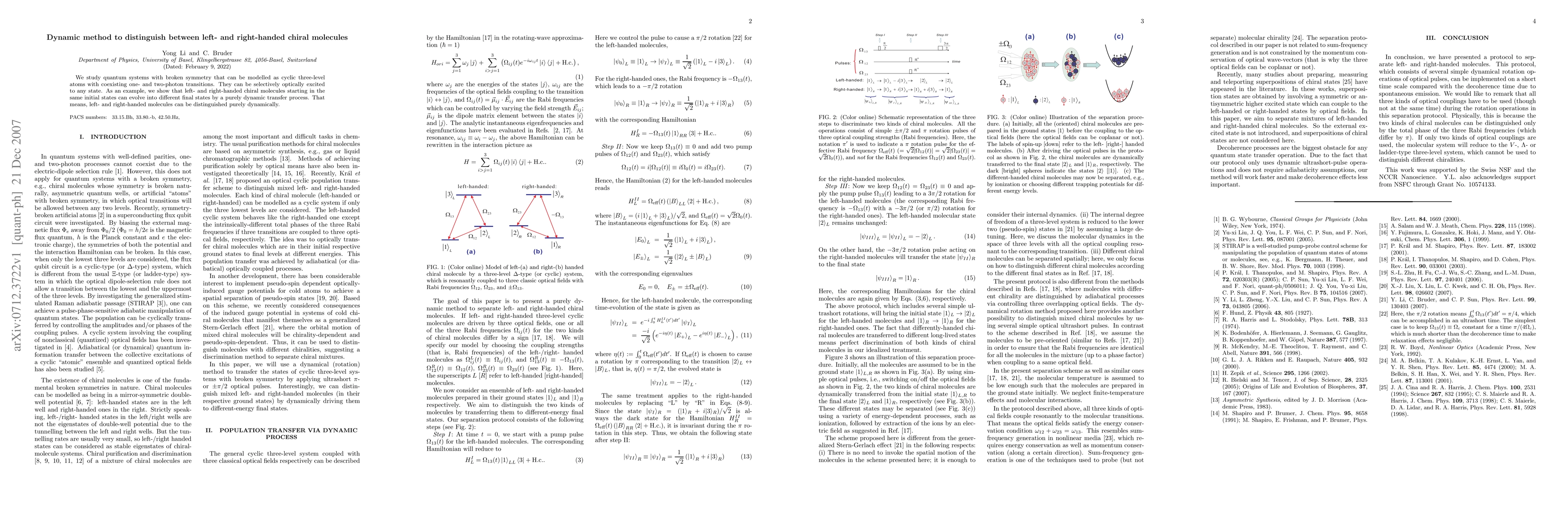 We study quantum systems with broken symmetry that can be modelled as cyclic three-level atoms with coexisting one- and two-photon transitions. They can be selectively optically excited to any state. As an example, we show that left- and right-handed chiral molecules starting in the same initial states can evolve into different final states by a purely dynamic transfer process. That means, left- and right-handed molecules can be distinguished purely dynamically.