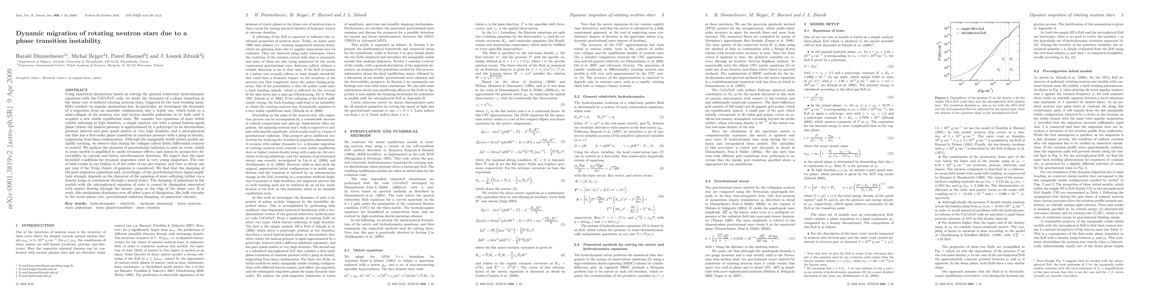 Using numerical simulations based on solving the general relativistic hydrodynamic equations, we study the dynamics of a phase transition in the dense core of isolated rotating neutron stars, triggered by the back bending instability reached via angular momentum loss. In particular, we investigate the dynamics of a migration from an unstable configuration into a stable one, which leads to a mini-collapse of the neutron star and excites sizeable pulsations in its bulk until it acquires a new stable equilibrium state. We consider equations of state with softening at high densities, a simple analytic one with a mixed hadron-quark phase in an intermediate pressure interval and pure quark matter at very high densities, and a microphysical one that has a first-order phase transition, originating from kaon condensation. Although the marginally stable initial models are rigidly rotating, we observe that during the collapse (albeit little) differential rotation is created. We analyze the emission of gravitational radiation, which in some models is amplified by mode resonance effects, and assess its prospective detectability by interferometric detectors. We expect that the most favorable conditions for dynamic migration exist in very young magnetars. We find that the damping of the post-migration pulsations strongly depends on the character of the equation of state softening. The damping of pulsations in the models with the microphysical equation of state is caused by dissipation associated with matter flowing through the density jump at the edge of the dense core. If at work, this mechanism dominates over all other types of dissipation, like bulk viscosity in the exotic-phase core, gravitational radiation damping, or numerical viscosity.