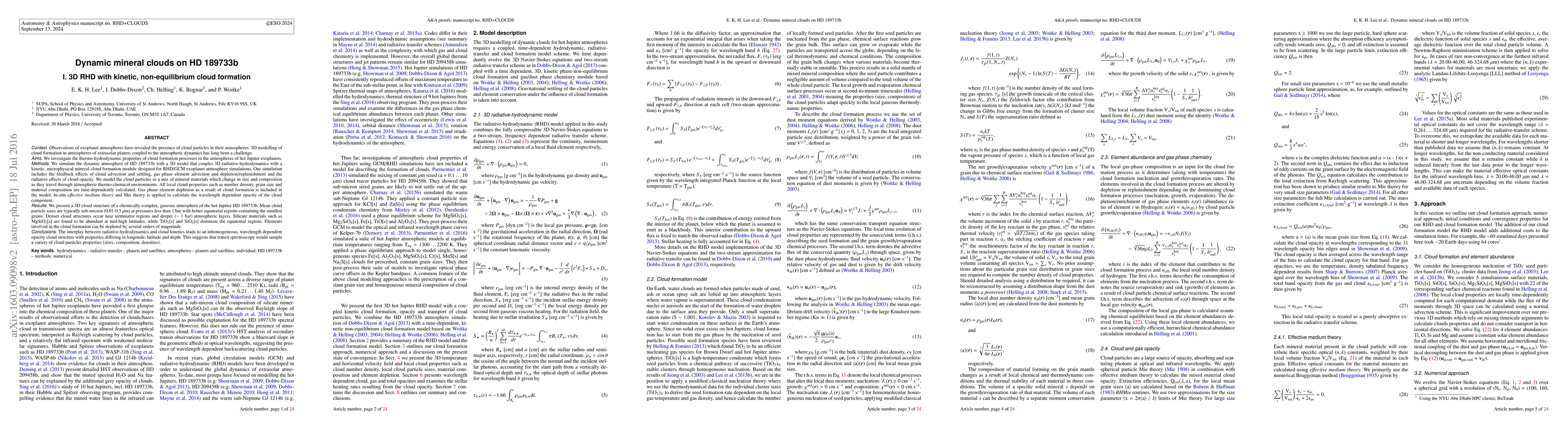 This research models the dynamic atmosphere of the hot Jupiter exoplanet HD 189733b using a 3D model that combines radiative-hydrodynamics with a kinetic cloud formation module, revealing sub-micron mineral clouds with varying compositions and sizes influenced by atmospheric dynamics and thermo-chemical environments.