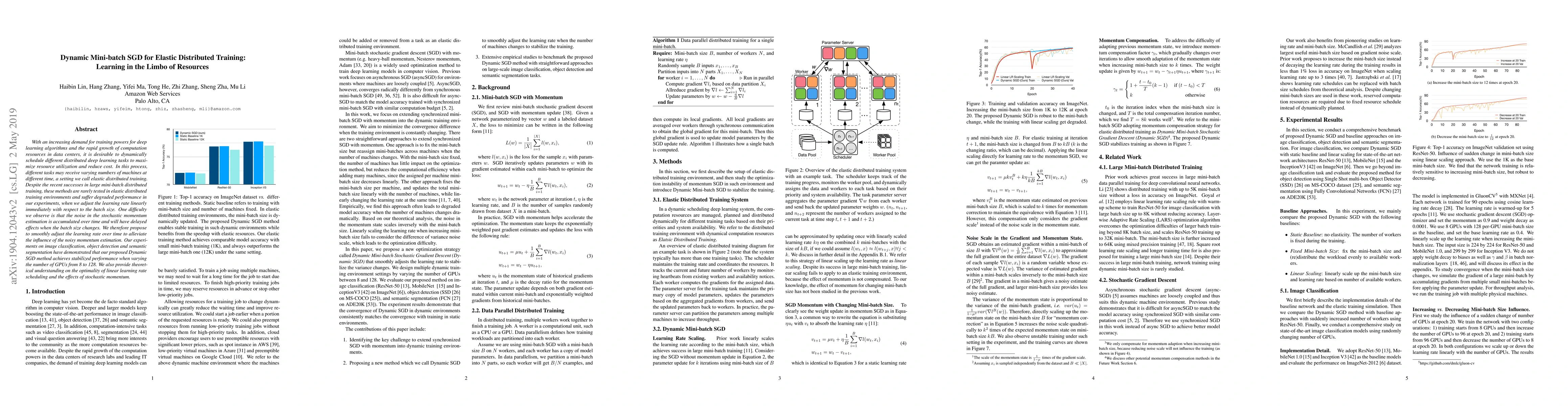 This paper proposes Dynamic Mini-batch SGD for elastic distributed training to optimize resource utilization and minimize costs. The authors address performance degradation in elastic settings by introducing a method to smoothly adjust the learning rate over time to mitigate noisy momentum estimation, achieving stabilized performance across varying GPU counts.