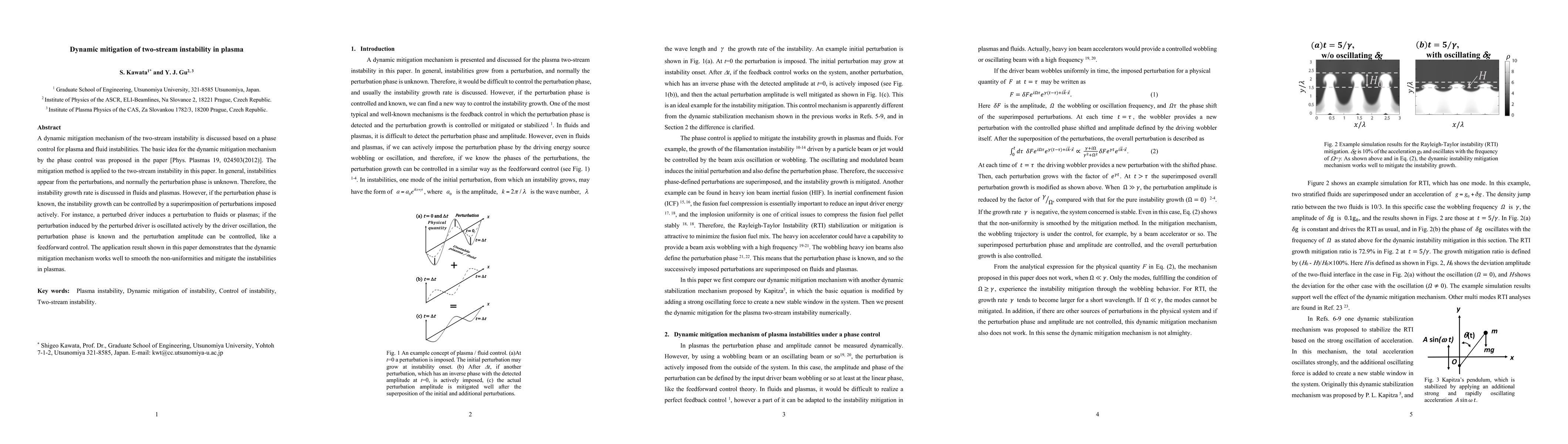 This paper presents a dynamic mitigation method for two-stream instability in plasmas using phase control. The technique involves actively oscillating perturbations to control their amplitude and phase, thereby smoothing non-uniformities and mitigating instabilities.