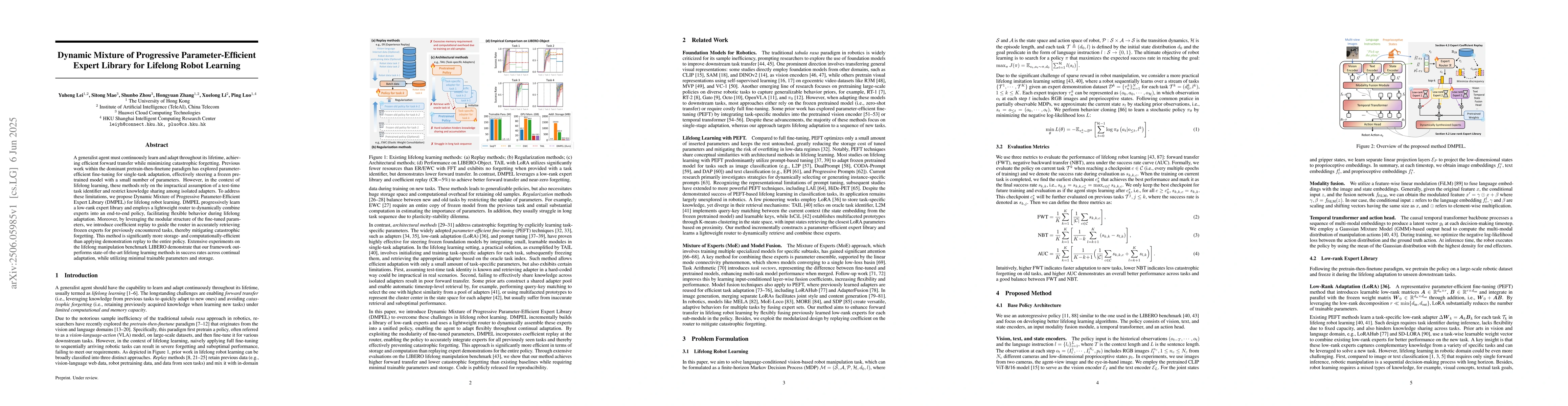 This research proposes Dynamic Mixture of Progressive Parameter-Efficient Expert Library (DMPEL) to enable lifelong robot learning with efficient adaptation and minimal forgetting.