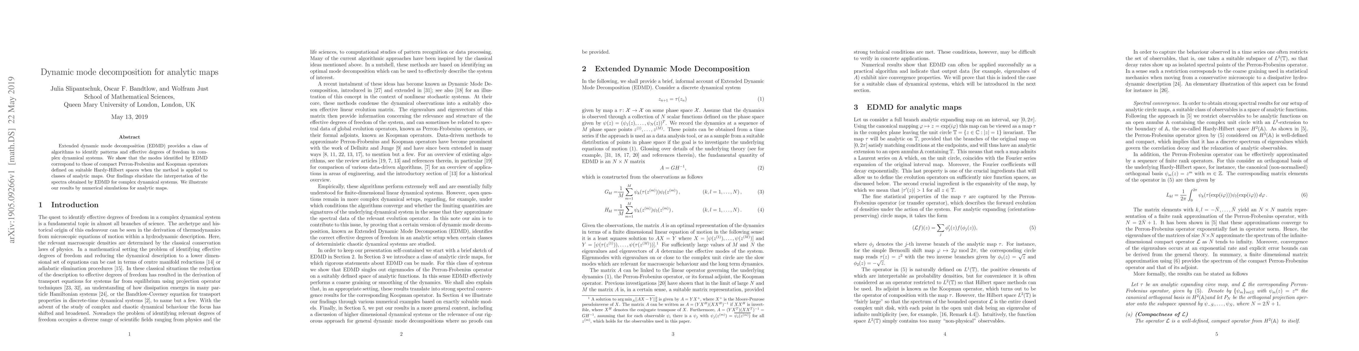 Extended dynamic mode decomposition (EDMD) provides a class of algorithms to identify patterns and effective degrees of freedom in complex dynamical systems. We show that the modes identified by EDMD correspond to those of compact Perron-Frobenius and Koopman operators defined on suitable Hardy-Hilbert spaces when the method is applied to classes of analytic maps. Our findings elucidate the interpretation of the spectra obtained by EDMD for complex dynamical systems. We illustrate our results by numerical simulations for analytic maps.