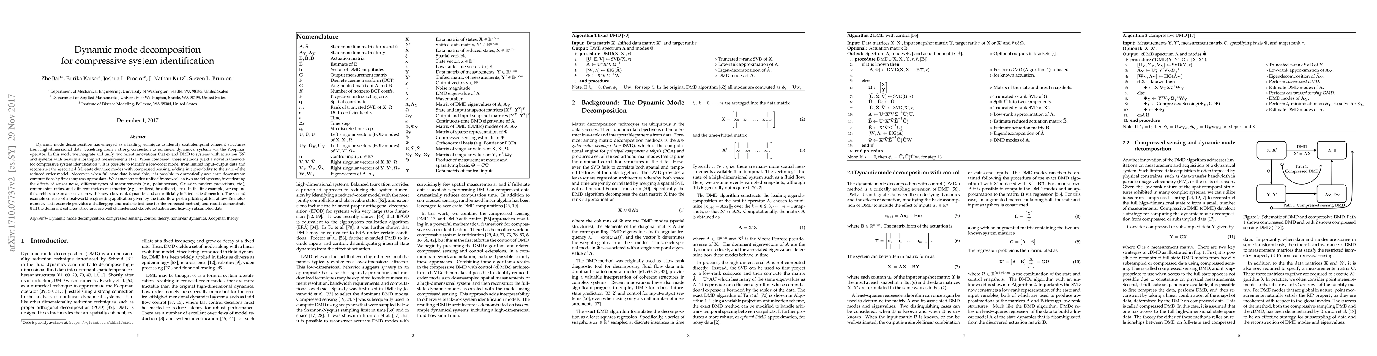 This paper proposes a novel framework for compressive system identification using dynamic mode decomposition (DMD), integrating innovations for systems with actuation and subsampled measurements. The unified approach enables low-order model identification from limited data and reconstructs full-state dynamic modes with compressed sensing, demonstrating effectiveness on both synthetic and real-world fluid flow applications.