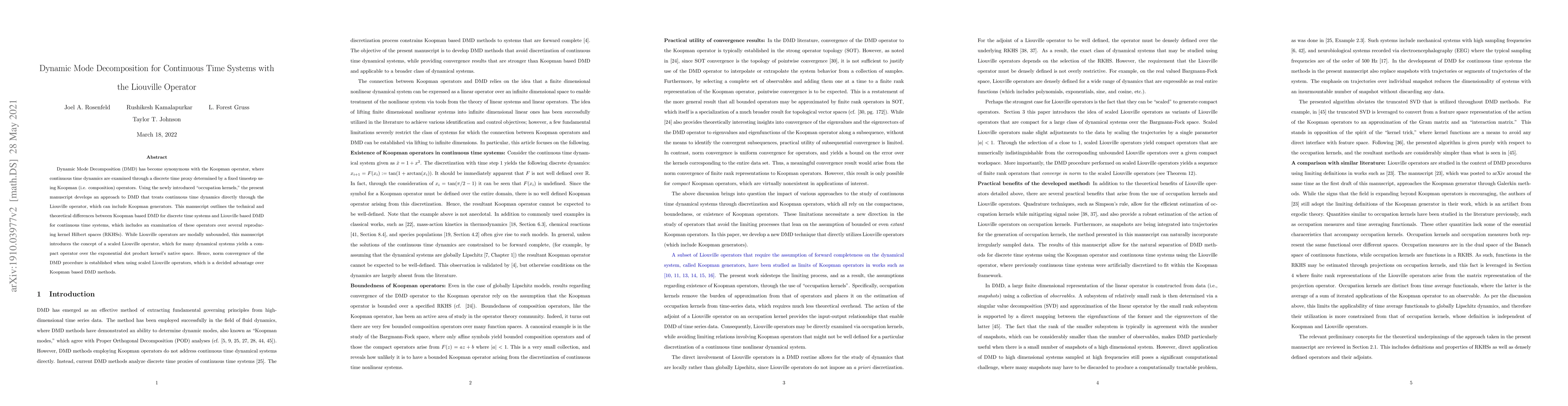 This paper develops a Dynamic Mode Decomposition (DMD) approach using the Liouville operator for continuous time systems, contrasting it with Koopman operator-based DMD for discrete time systems. It introduces scaled Liouville operators to ensure norm convergence, offering a significant advantage over traditional Koopman-based methods.