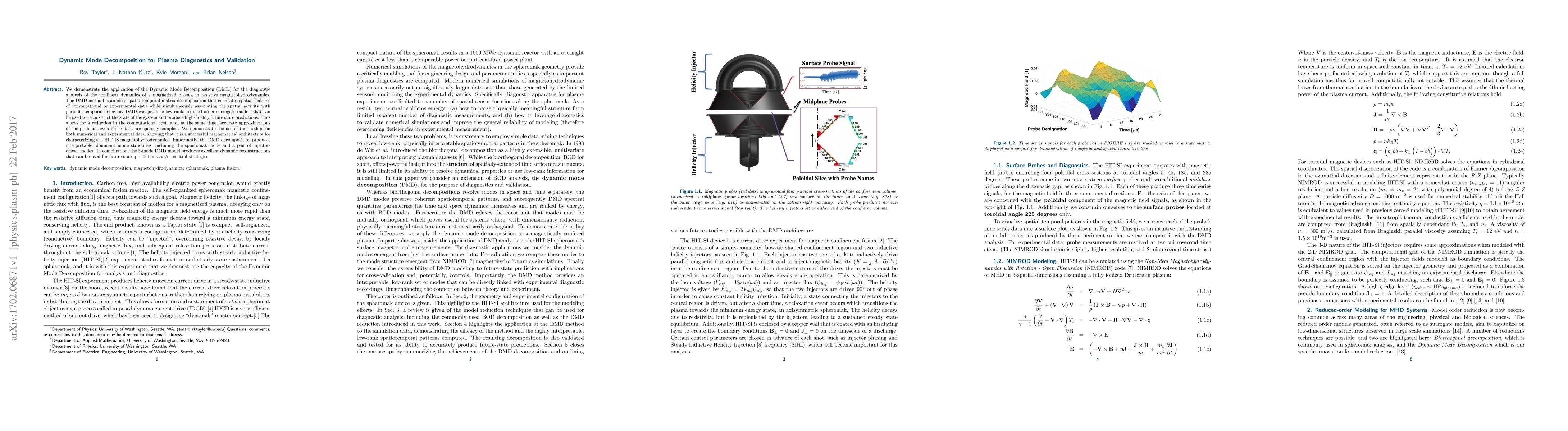 We demonstrate the application of the Dynamic Mode Decomposition (DMD) for the diagnostic analysis of the nonlinear dynamics of a magnetized plasma in resistive magnetohydrodynamics. The DMD method is an ideal spatio-temporal matrix decomposition that correlates spatial features of computational or experimental data while simultaneously associating the spatial activity with periodic temporal behavior. DMD can produce low-rank, reduced order surrogate models that can be used to reconstruct the state of the system and produce high-fidelity future state predictions. This allows for a reduction in the computational cost, and, at the same time, accurate approximations of the problem, even if the data are sparsely sampled. We demonstrate the use of the method on both numerical and experimental data, showing that it is a successful mathematical architecture for characterizing the HIT-IS magnetohydrodynamics. Importantly, the DMD decomposition produces interpretable, dominant mode structures, including the spheromak mode and a pair of injector-driven modes. In combination, the 3-mode DMD model produces excellent dynamic reconstructions that can be used for future state prediction and/or control strategies.