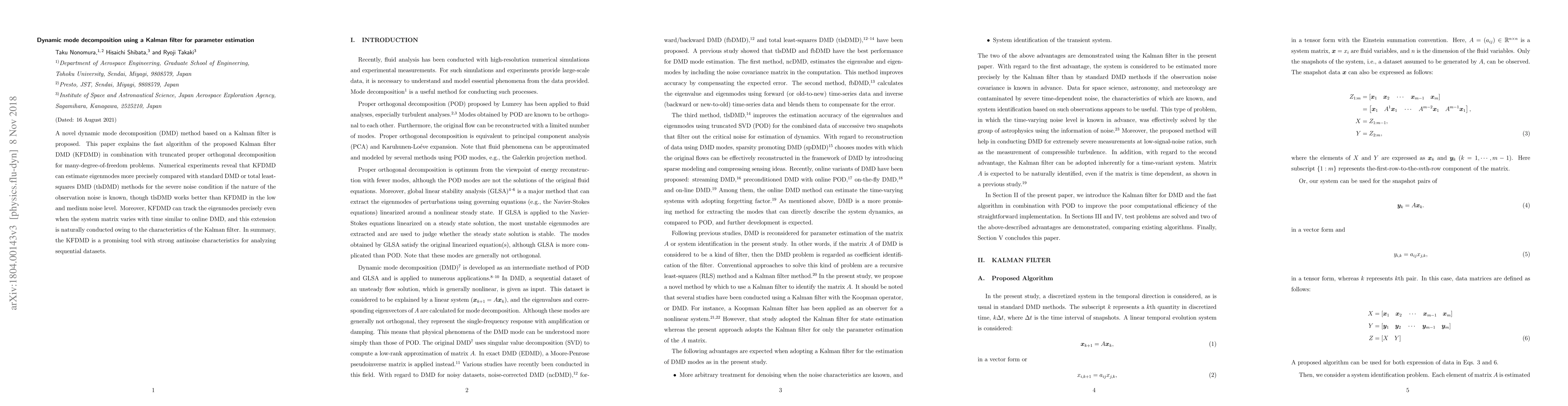 A novel dynamic mode decomposition (DMD) method based on a Kalman filter is proposed. This paper explains the fast algorithm of the proposed Kalman filter DMD (KFDMD) in combination with truncated proper orthogonal decomposition for many-degree-of-freedom problems. Numerical experiments reveal that KFDMD can estimate eigenmodes more precisely compared with standard DMD or total least-squares DMD (tlsDMD) methods for the severe noise condition if the nature of the observation noise is known, though tlsDMD works better than KFDMD in the low and medium noise level. Moreover, KFDMD can track the eigenmodes precisely even when the system matrix varies with time similar to online DMD, and this extension is naturally conducted owing to the characteristics of the Kalman filter. In summary, the KFDMD is a promising tool with strong antinoise characteristics for analyzing sequential datasets.