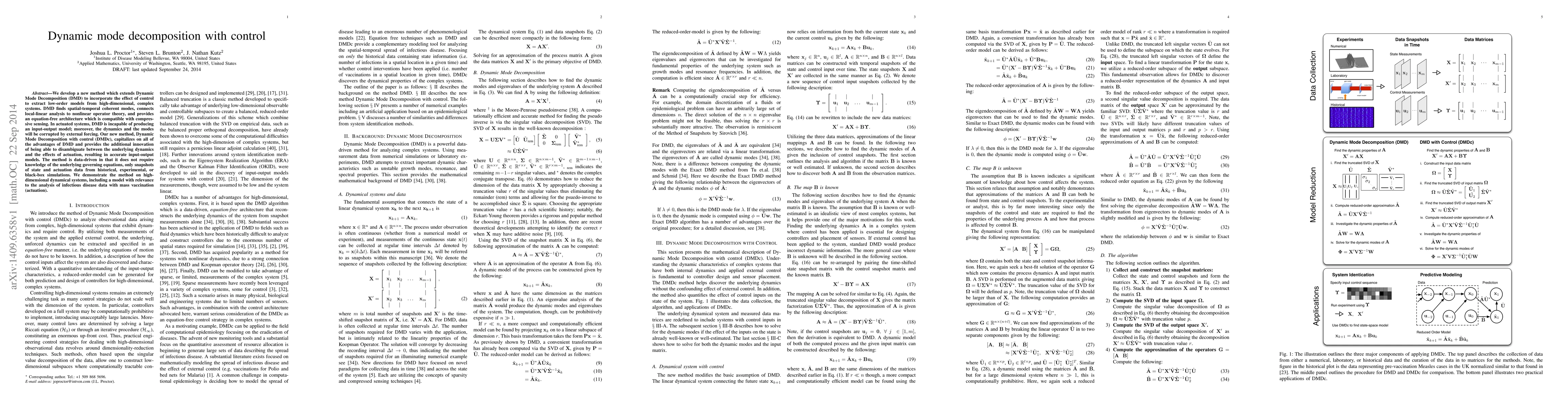 Dynamic Mode Decomposition with control (DMDc) extends DMD to extract low-order models from complex systems by disambiguating underlying dynamics from external forcing effects, providing accurate input-output models without requiring knowledge of governing equations. Demonstrated on high-dimensional systems, including infectious disease models with mass vaccination.