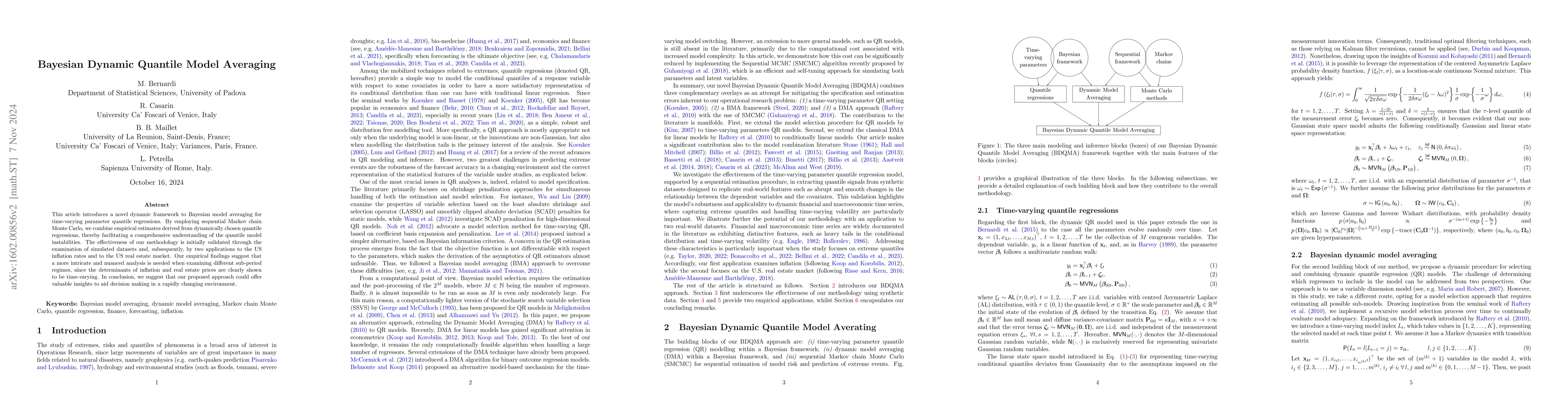 The paper introduces a novel Bayesian Dynamic Quantile Model Averaging (BDQMA) approach, combining Bayesian time-varying quantile regressions and dynamic model averaging in a tractable manner using Gaussian mixtures, conditional normal state-space representations, and sequential Monte Carlo methods.