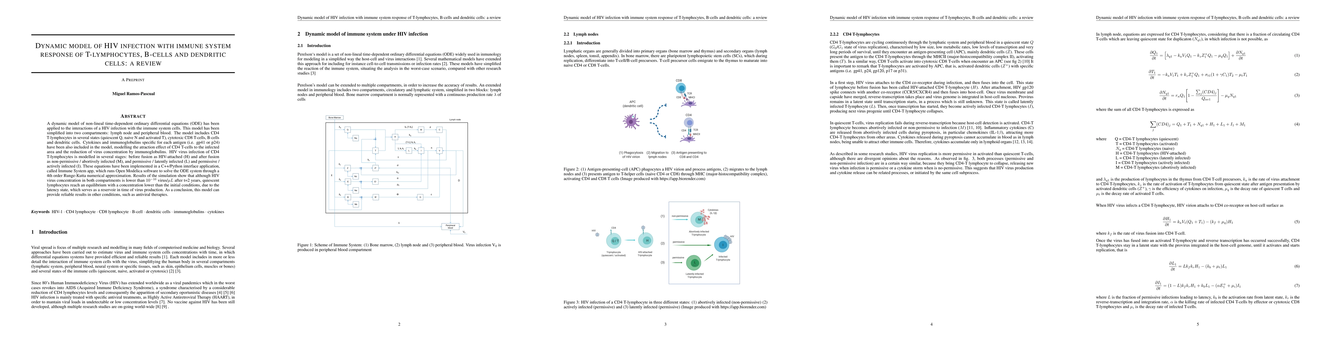 This paper reviews a dynamic model using nonlinear ODEs to simulate HIV infection and the immune system's response, focusing on T-lymphocytes, B-cells, and dendritic cells. The model, implemented in a C++/Python interface, shows that HIV concentration drops significantly over two years, but latently infected quiescent lymphocytes maintain a reservoir of virus.