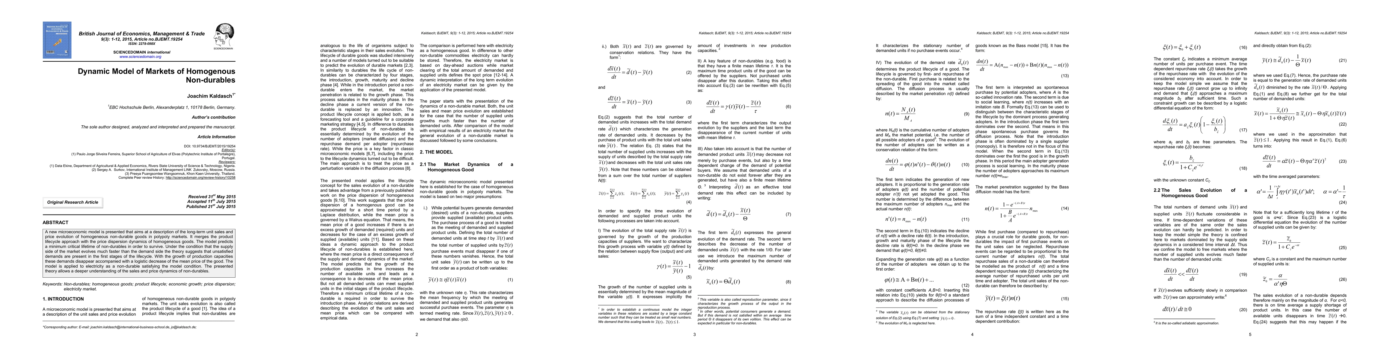 A new microeconomic model is presented that aims at a description of the long-term unit sales and price evolution of homogeneous non-durable goods in polypoly markets. It merges the product lifecycle approach with the price dispersion dynamics of homogeneous goods. The model predicts a minimum critical lifetime of non-durables in order to survive. Under the condition that the supply side of the market evolves much faster than the demand side the theory suggests that unsatisfied demands are present in the first stages of the lifecycle. With the growth of production capacities these demands disappear accompanied with a logistic decrease of the mean price of the good. The model is applied to electricity as a non-durable satisfying the model condition. The presented theory allows a deeper understanding of the sales and price dynamics of non-durables.