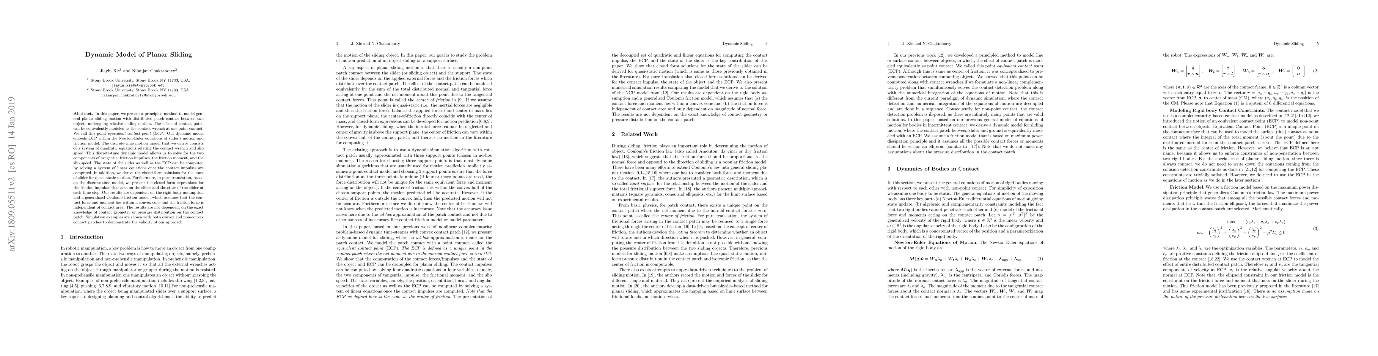 In this paper, we present a principled method to model general planar sliding motion with distributed convex contact patch. The effect of contact patch with indeterminate pressure distribution can be equivalently modeled as the contact wrench at one point contact. We call this point equivalent contact point. Our dynamic model embeds ECP within the equations of slider's motion and friction model which approximates the distributed contact patch, and eventually brings us a system of quadratic equations. This discrete-time dynamic model allows us to solve for the two components of tangential friction impulses, the friction moment and the slip speed. The state of the slider as well as the ECP can be computed by solving a system of linear equations once the contact impulses are computed. In addition, we derive the closed form solutions for the state of slider for quasi-static motion. Furthermore, in pure translation case, based on the discrete-time model, we present the closed form expressions for the friction impulses the slider suffers and the state of it at each time step. Simulation examples are shown to demonstrate the validity of our approach.