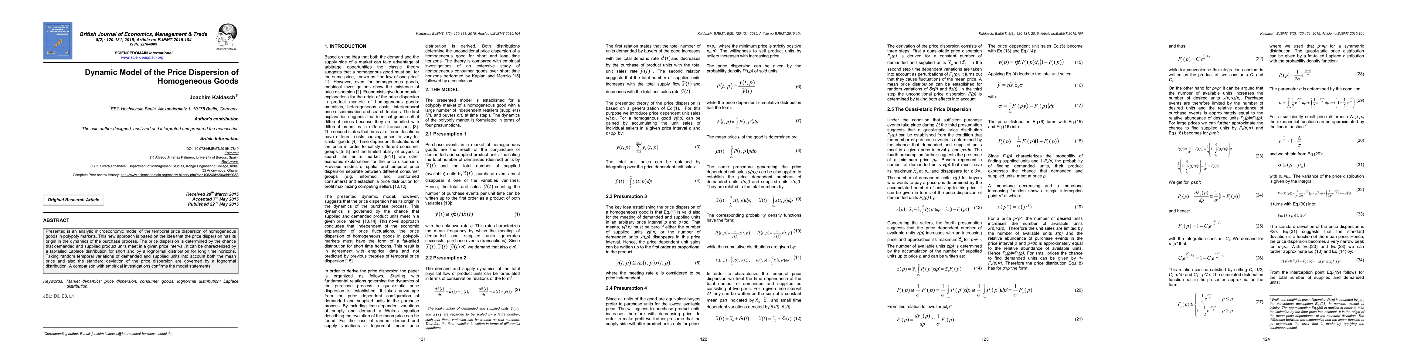 Presented is an analytic microeconomic model of the temporal price dispersion of homogeneous goods in polypoly markets. This new approach is based on the idea that the price dispersion has its origin in the dynamics of the purchase process. The price dispersion is determined by the chance that demanded and supplied product units meet in a given price interval. It can be characterized by a fat-tailed Laplace distribution for short and by a lognormal distribution for long time horizons. Taking random temporal variations of demanded and supplied units into account both the mean price and also the standard deviation of the price dispersion are governed by a lognormal distribution. A comparison with empirical investigations confirms the model statements.