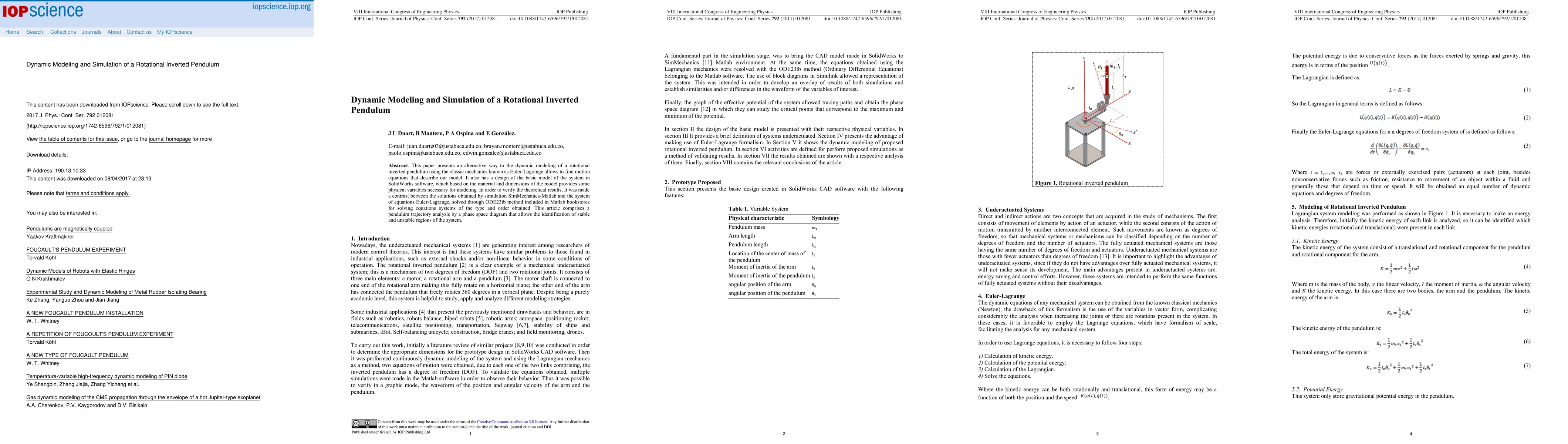 The Euler-Lagrange formalism was used to dynamic modeling of rotational inverted pendulum in a simple way