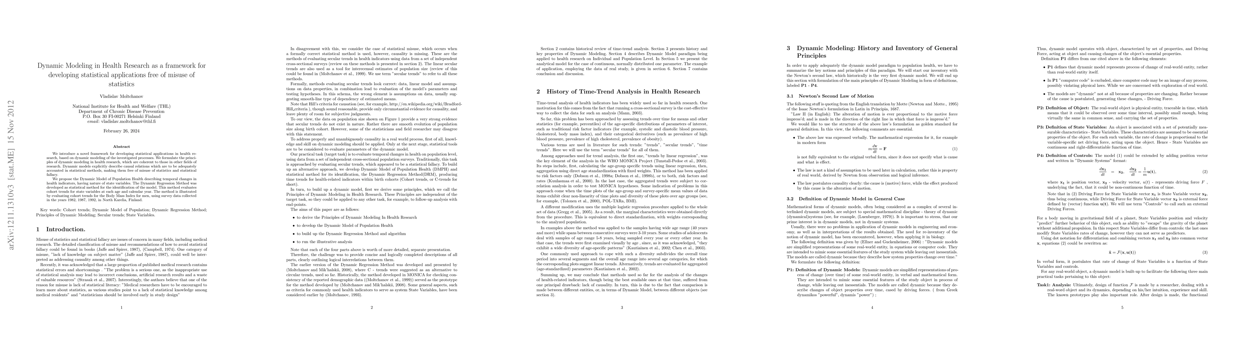 We introduce a novel framework for developing statistical applications in health research, based on dynamic modeling of the investigated processes. We formulate the principles of dynamic modeling in health research, which are coherent to those in other fields of research. Dynamic models explicitly describe causal relations which are to be adequately accounted in statistical methods, making them free of misuse of statistics and statistical fallacy. We propose the Dynamic Model of Population Health describing temporal changes in health indicators, having nature of state variables. The Dynamic Regression Method was developed as statistical method for the identification of the model. This method evaluates cohort trends for state variables at each age and calendar year. The method is illustrated by evaluating cohort trends for the Body Mass Index for men, using survey data collected in the years 1982, 1987, 1992, in North Karelia, Finland.