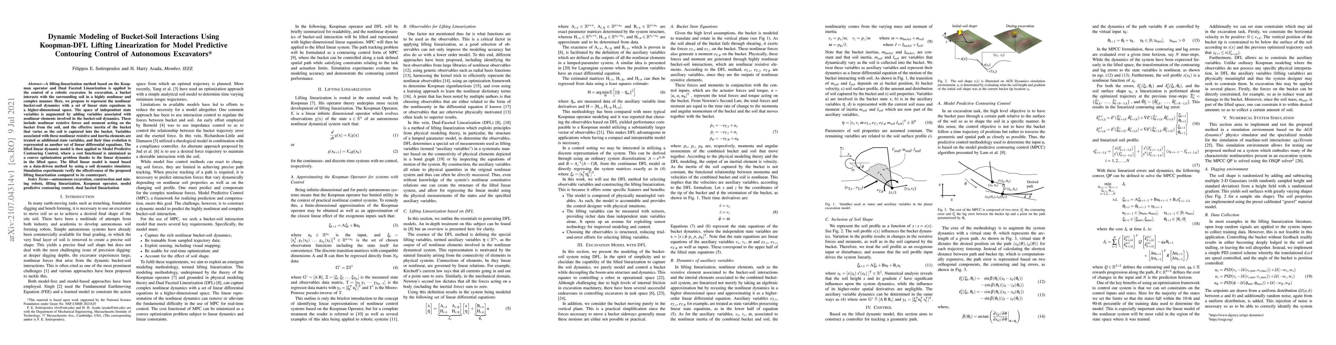 This paper proposes a lifting-linearization method using Koopman operator and Dual Faceted Linearization to model nonlinear bucket-soil interactions in robotic excavators, enabling effective Model Predictive Contouring Control through a convex optimization problem. Simulation results demonstrate the effectiveness of the proposed approach compared to traditional methods.