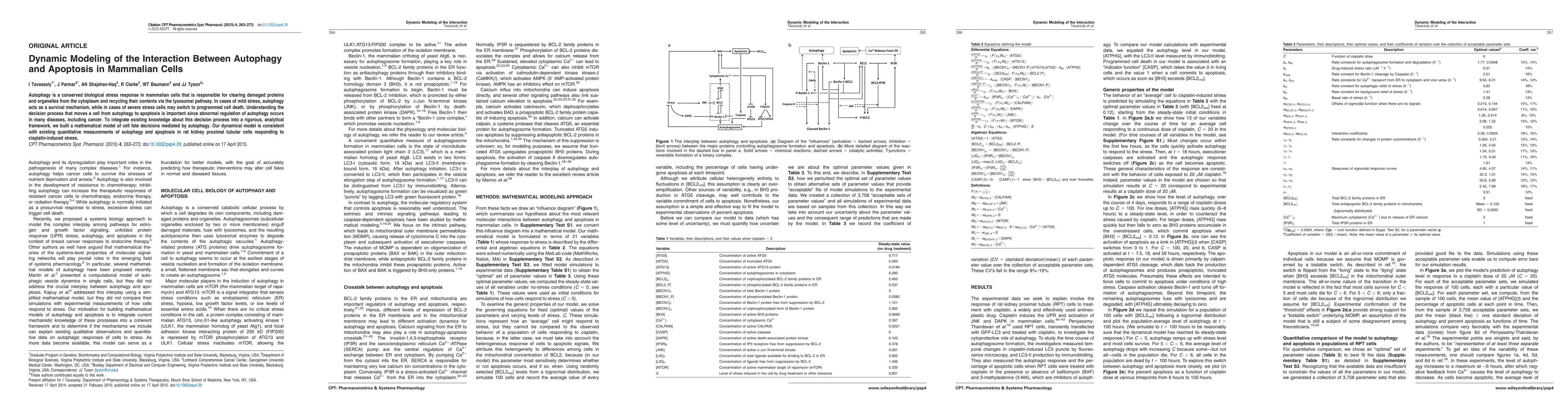 Autophagy is a conserved biological stress response in mammalian cells that is responsible for clearing damaged proteins and organelles from the cytoplasm and recycling their contents via the lysosomal pathway. In cases of mild stress, autophagy acts as a survival mechanism, while in cases of severe stress cells may switch to programmed cell death. Understanding the decision process that moves a cell from autophagy to apoptosis is important since abnormal regulation of autophagy occurs in many diseases, including cancer. To integrate existing knowledge about this decision process into a rigorous, analytical framework, we built a mathematical model of cell fate decisions mediated by autophagy. Our dynamical model is consistent with existing quantitative measurements of autophagy and apoptosis in rat kidney proximal tubular cells responding to cisplatin-induced stress.