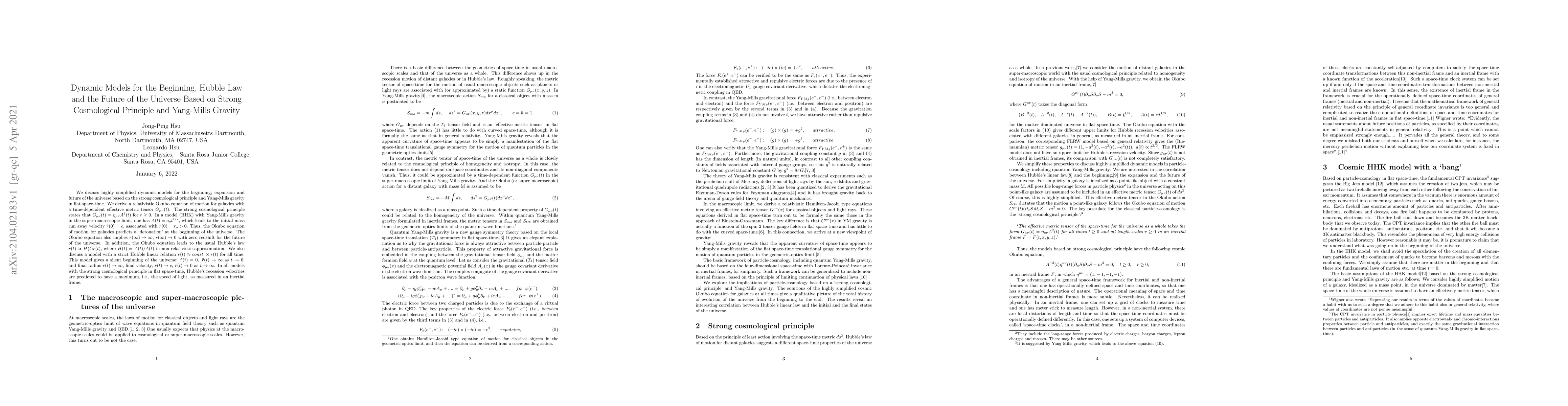 We discuss highly simplified dynamic models for the beginning, expansion and future of the universe based on the strong cosmological principle and Yang-Mills gravity in flat space-time. We derive a relativistic Okubo equation of motion for galaxies with a time-dependent effective metric tensor $G_{\mu\nu}(t)$. The strong cosmological principle states that $G_{\mu\nu}(t)=\e_{\mu\nu} A^2(t)$ for $t \ge 0$. In a model (HHK) with Yang-Mills gravity in the super-macroscopic limit, one has $A(t)= a_o t^{1/2}$, which leads to the initial mass run away velocity $\dot{r}(0)=c$, associated with $r(0)=r_o>0$. Thus, the Okubo equation of motion for galaxies predicts a `detonation' at the beginning of the universe. The Okubo equation also implies $r(\infty) \to \infty$, $\dot{r}(\infty) \to 0$ with zero redshift for the future of the universe. In addition, the Okubo equation leads to the usual Hubble's law $\dot{r}(t) \approx H(t) r(t)$, where $H(t)=\dot{A}(t)/A(t)$ in non-relativistic approximation. We also discuss a model with a strict Hubble linear relation $\dot{r}(t) \approx const.\times r(t)$ for all time. This model gives a silent beginning of the universe: $\dot{r}(t)=0, \ \ddot{r}(t)\to\infty$ as $t \to 0$; and final radius $r(t) \to \infty,$ final velocity, $\dot{r}(t) \to c$, $\ddot{r}(t)\to 0$ as $t \to \infty$. In all models with the strong cosmological principle in flat space-time, Hubble's recession velocities are predicted to have a maximum, i.e., the speed of light, as measured in an inertial frame.