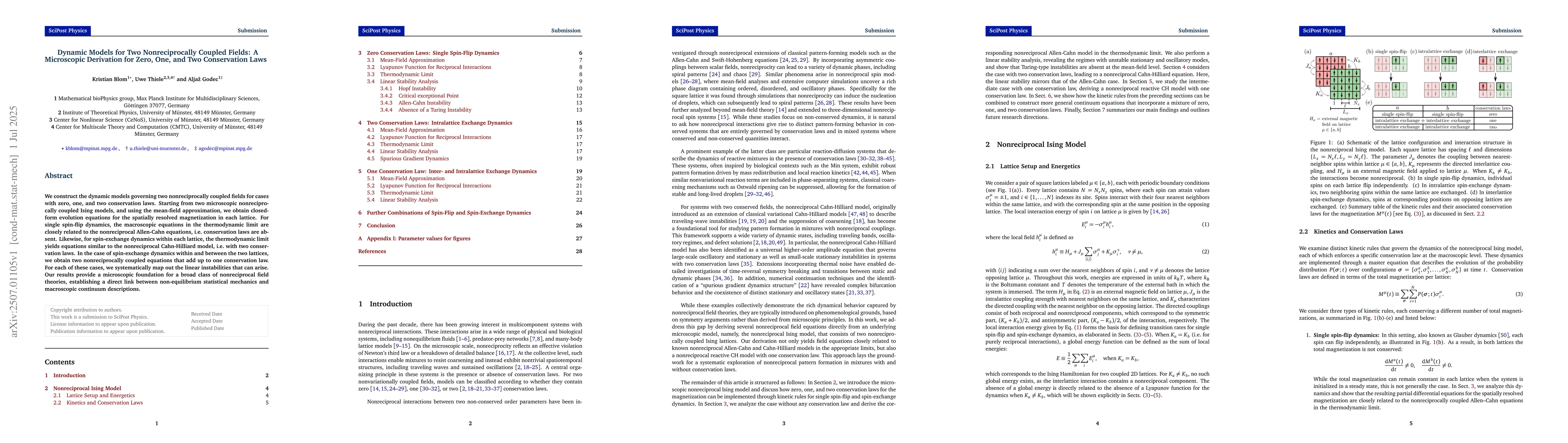 The research derives macroscopic continuum field equations for two nonreciprocally coupled scalar fields with zero, one, and two conservation laws from microscopic nonreciprocally coupled Ising models using mean-field approximation and thermodynamic limit.