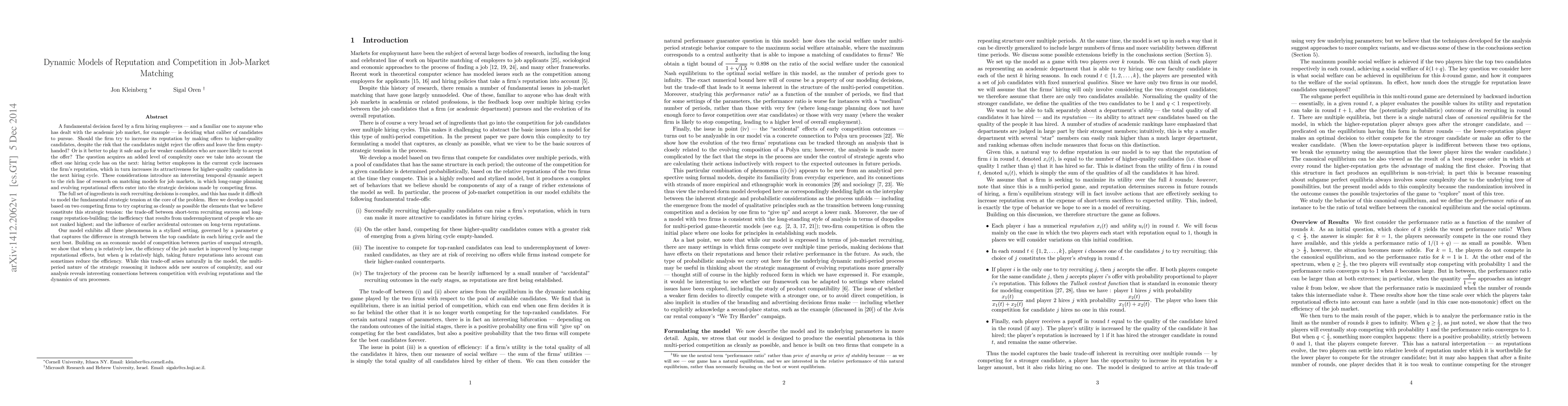 A fundamental decision faced by a firm hiring employees - and a familiar one to anyone who has dealt with the academic job market, for example - is deciding what caliber of candidates to pursue. Should the firm try to increase its reputation by making offers to higher-quality candidates, despite the risk that the candidates might reject the offers and leave the firm empty-handed? Or should it concentrate on weaker candidates who are more likely to accept the offer? The question acquires an added level of complexity once we take into account the effect one hiring cycle has on the next: hiring better employees in the current cycle increases the firm's reputation, which in turn increases its attractiveness for higher-quality candidates in the next hiring cycle. These considerations introduce an interesting temporal dynamic aspect to the rich line of research on matching models for job markets, in which long-range planning and evolving reputational effects enter into the strategic decisions made by competing firms. We develop a model based on two competing firms to try capturing as cleanly as possible the elements that we believe constitute the strategic tension at the core of the problem: the trade-off between short-term recruiting success and long-range reputation-building; the inefficiency that results from underemployment of people who are not ranked highest; and the influence of earlier accidental outcomes on long-term reputations. Our model exhibits all these phenomena in a stylized setting, governed by a parameter q that captures the difference in strength between the two top candidates in each hiring cycle. We show that when q is relatively low the efficiency of the job market is improved by long-range reputational effects, but when q is relatively high, taking future reputations into account can sometimes reduce the efficiency.