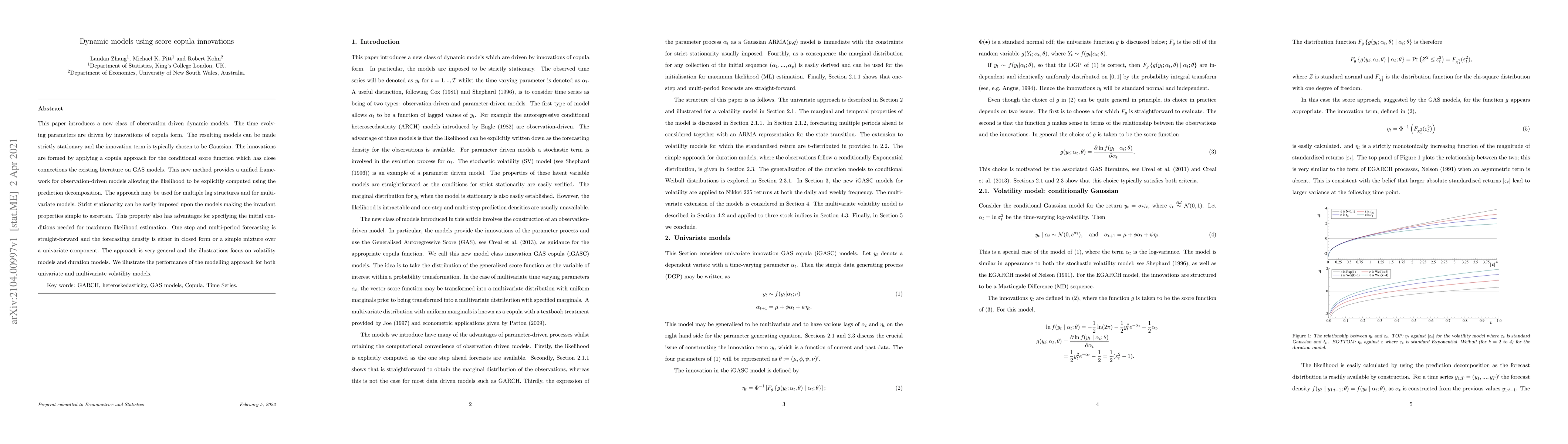 This paper introduces a new class of observation driven dynamic models. The time evolving parameters are driven by innovations of copula form. The resulting models can be made strictly stationary and the innovation term is typically chosen to be Gaussian. The innovations are formed by applying a copula approach for the conditional score function which has close connections the existing literature on GAS models. This new method provides a unified framework for observation-driven models allowing the likelihood to be explicitly computed using the prediction decomposition. The approach may be used for multiple lag structures and for multivariate models. Strict stationarity can be easily imposed upon the models making the invariant properties simple to ascertain. This property also has advantages for specifying the initial conditions needed for maximum likelihood estimation. One step and multi-period forecasting is straight-forward and the forecasting density is either in closed form or a simple mixture over a univariate component. The approach is very general and the illustrations focus on volatility models and duration models. We illustrate the performance of the modelling approach for both univariate and multivariate volatility models.