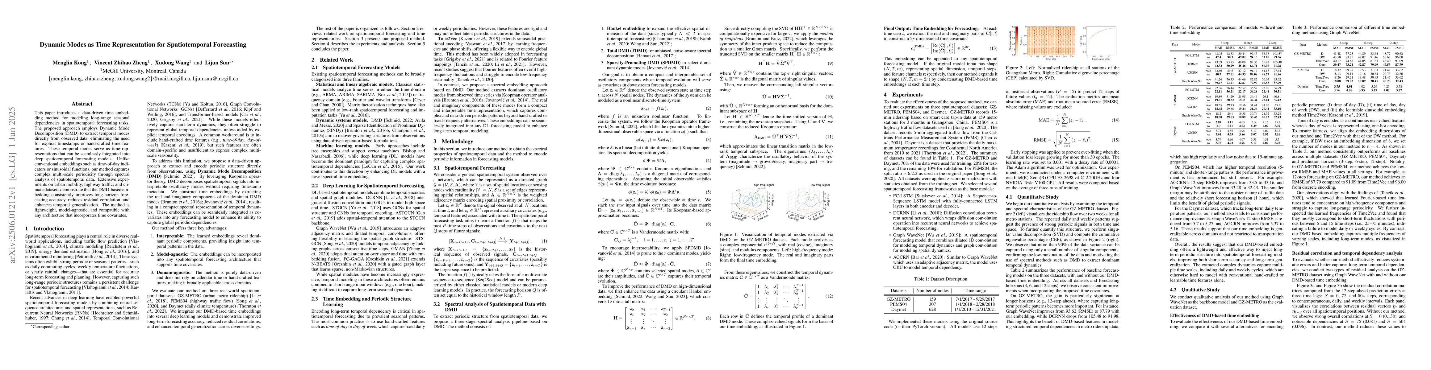 The research introduces a data-driven time embedding method using Dynamic Mode Decomposition (DMD) to extract temporal modes from observed spatiotemporal data, eliminating the need for explicit timestamps or hand-crafted time features.