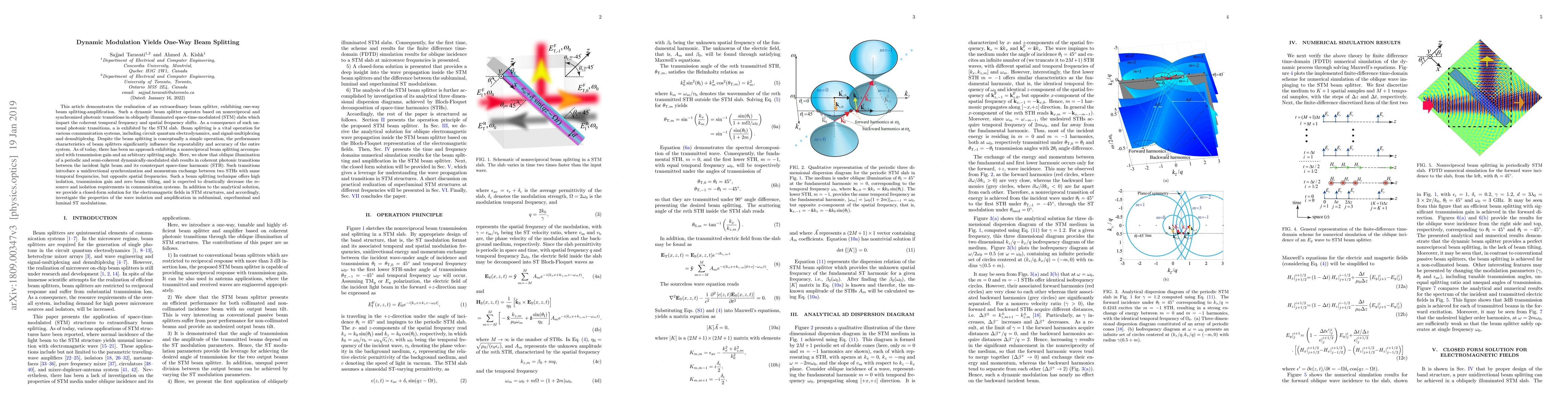 This article demonstrates the realization of an extraordinary beam splitter based on nonreciprocal and synchronized photonic transitions in obliquely illuminated space-time-modulated (STM) slabs which impart the coherent temporal frequency and spatial frequency shifts. As a consequence of such unusual photonic transitions, a one-way beam splitting and amplification is exhibited by the STM slab. Beam splitting is a vital operation for various optical and photonic systems, ranging from quantum computation to fluorescence spectroscopy and microscopy. Despite the beam splitting is conceptually a simple operation, the performance characteristics of beam splitters significantly influence the repeatability and accuracy of the entire optical system. As of today, there has been no approach exhibiting a nonreciprocal beam splitting accompanied with transmission gain and an arbitrary splitting angle. Here, we show that oblique illumination of a periodic and semi-coherent dynamically-modulated slab results in coherent photonic transitions between the incident light beam and its counterpart space-time harmonic (STH). Such photonic transitions introduce a unidirectional synchronization and momentum exchange between two STHs with same temporal frequencies, but opposite spatial frequencies. Such a beam splitting technique offers high isolation, transmission gain and zero beam tilting, and is expected to drastically decrease the resource and isolation requirements in optical and photonic systems. In addition to the analytical solution, we provide a closed-form solution for the electromagnetic fields in STM structures, and accordingly, investigate the properties of the wave isolation and amplification in subluminal, superluminal and luminal ST modulations.