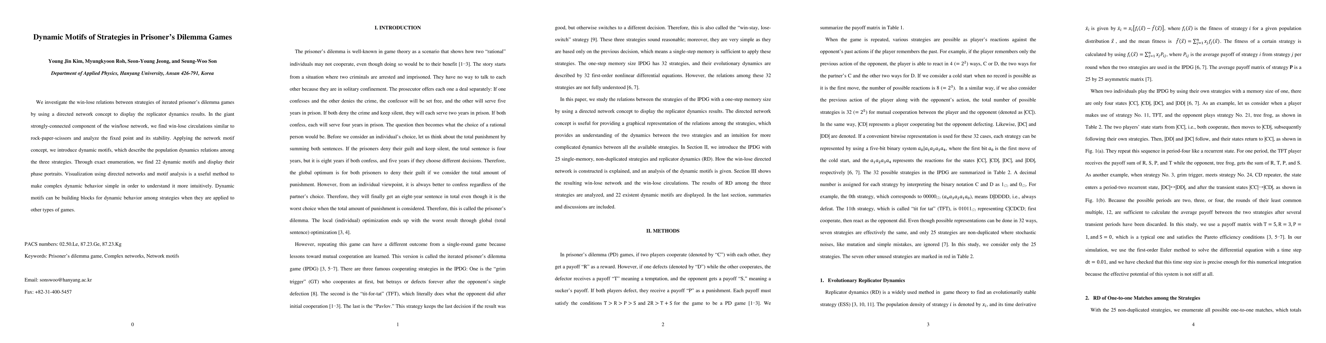 This paper explores the win-lose dynamics between strategies in iterated prisoner's dilemma games using directed network analysis, identifying 22 dynamic motifs that describe the population dynamics among strategies, akin to rock-paper-scissors, and revealing their stability through phase portraits. The study demonstrates that network motifs provide an intuitive understanding of complex dynamic behaviors in strategic interactions.