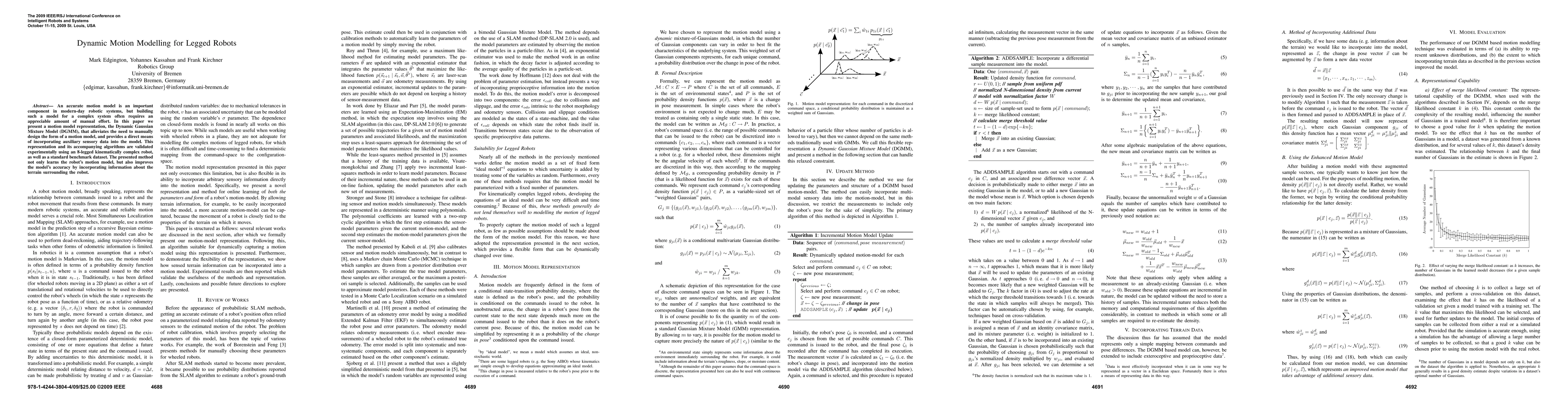 This paper introduces the Dynamic Gaussian Mixture Model (DGMM) to simplify the creation of motion models for legged robots, reducing manual effort and enhancing accuracy by integrating auxiliary sensory data, validated through experiments with an 8-legged robot and a benchmark dataset.