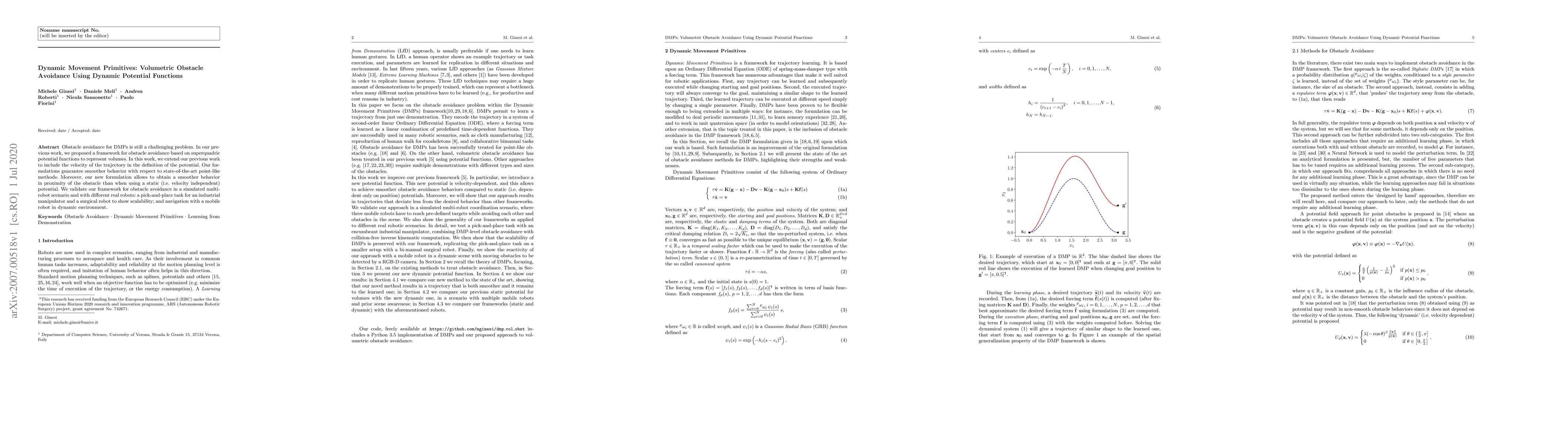 Obstacle avoidance for DMPs is still a challenging problem. In our previous work, we proposed a framework for obstacle avoidance based on superquadric potential functions to represent volumes. In this work, we extend our previous work to include the velocity of the trajectory in the definition of the potential. Our formulations guarantee smoother behavior with respect to state-of-the-art point-like methods. Moreover, our new formulation allows to obtain a smoother behavior in proximity of the obstacle than when using a static (i.e. velocity independent) potential. We validate our framework for obstacle avoidance in a simulated multi-robot scenario and with different real robots: a pick-and-place task for an industrial manipulator and a surgical robot to show scalability; and navigation with a mobile robot in dynamic environment.