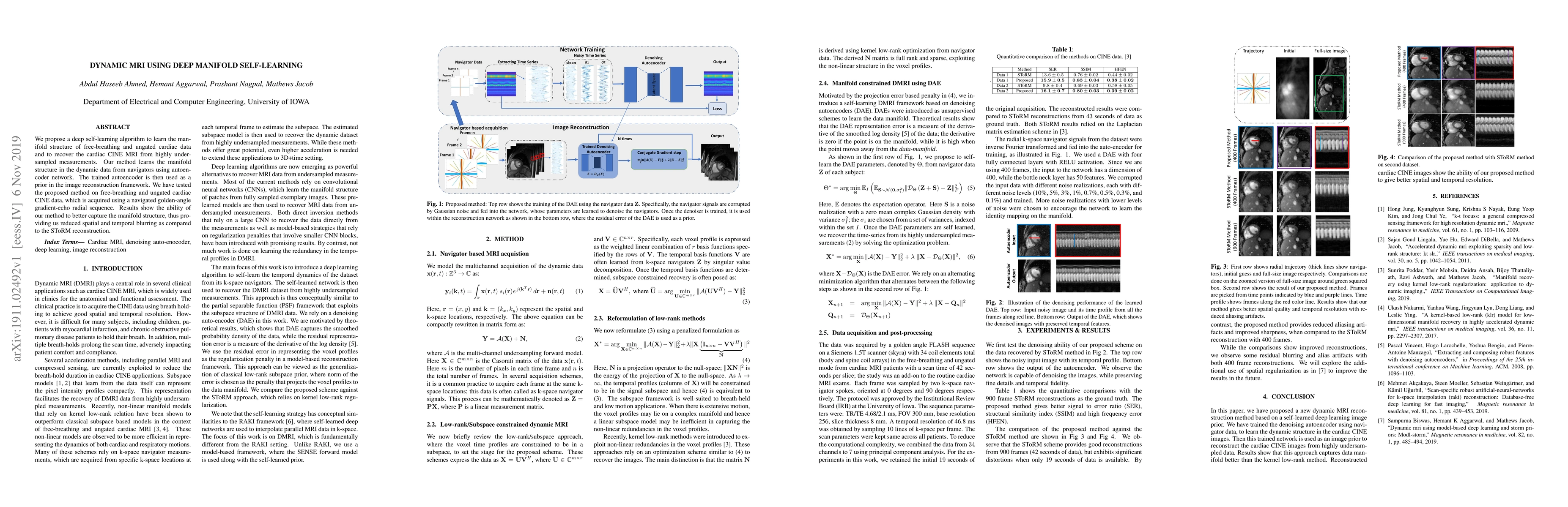 This paper proposes a deep self-learning algorithm to reconstruct dynamic cardiac CINE MRI from undersampled data by learning the manifold structure using an autoencoder. The method shows improved spatial and temporal resolution compared to traditional reconstruction techniques.