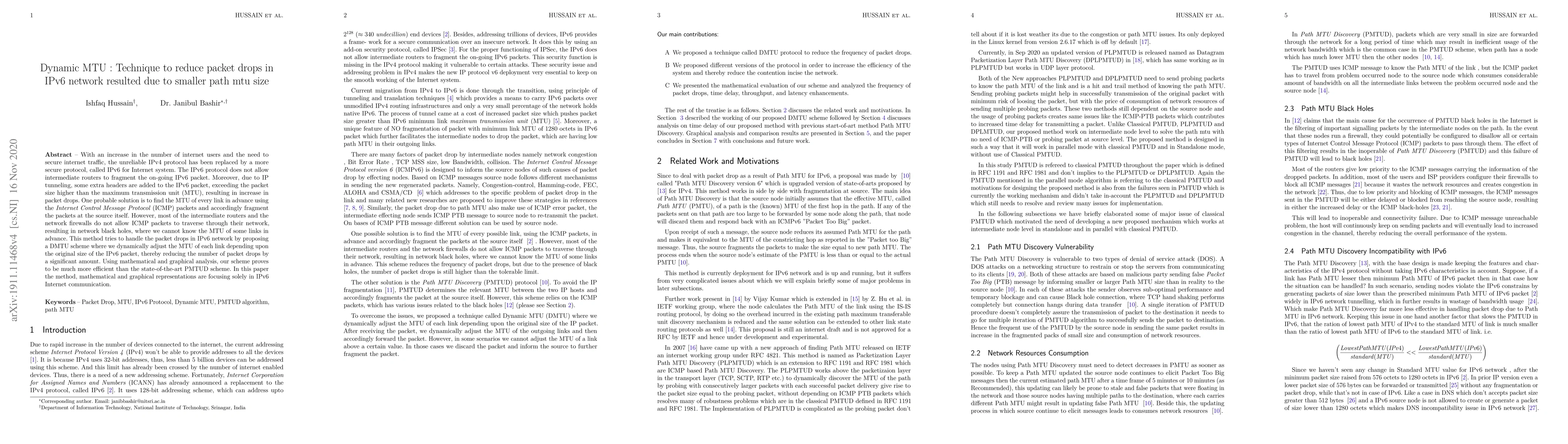 The paper proposes a Dynamic MTU (DMTU) technique to reduce packet drops in IPv6 networks caused by exceeding the maximum transmission unit (MTU) due to IP tunneling. The DMTU scheme dynamically adjusts the MTU based on the original packet size, significantly reducing packet drops compared to traditional PMTUD methods, as demonstrated through mathematical and graphical analysis.