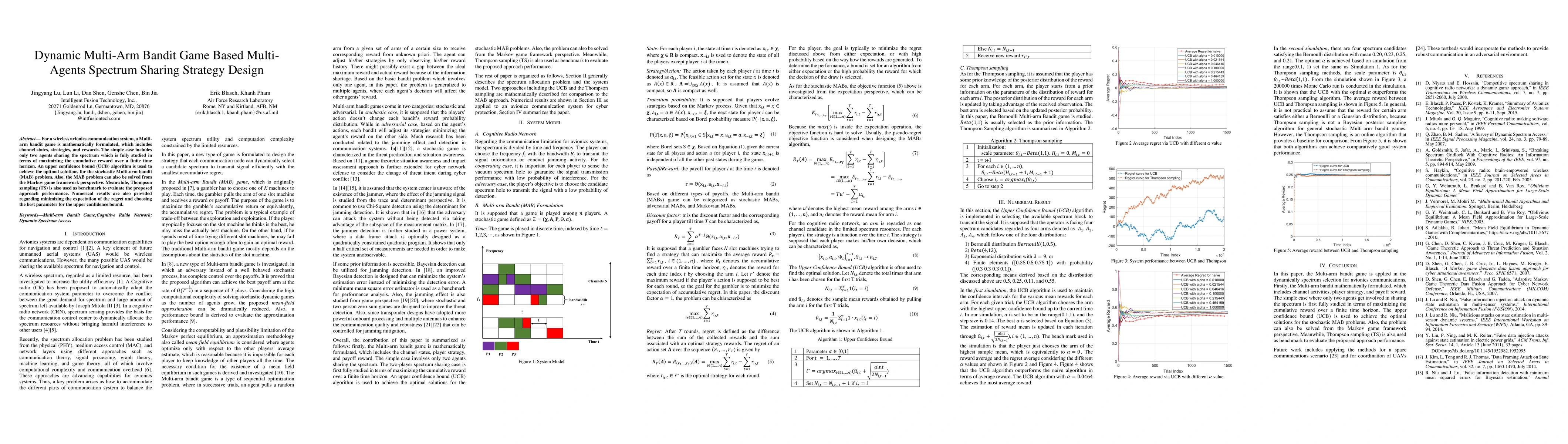 For a wireless avionics communication system, a Multi-arm bandit game is mathematically formulated, which includes channel states, strategies, and rewards. The simple case includes only two agents sharing the spectrum which is fully studied in terms of maximizing the cumulative reward over a finite time horizon. An Upper Confidence Bound (UCB) algorithm is used to achieve the optimal solutions for the stochastic Multi-Arm Bandit (MAB) problem. Also, the MAB problem can also be solved from the Markov game framework perspective. Meanwhile, Thompson Sampling (TS) is also used as benchmark to evaluate the proposed approach performance. Numerical results are also provided regarding minimizing the expectation of the regret and choosing the best parameter for the upper confidence bound.
