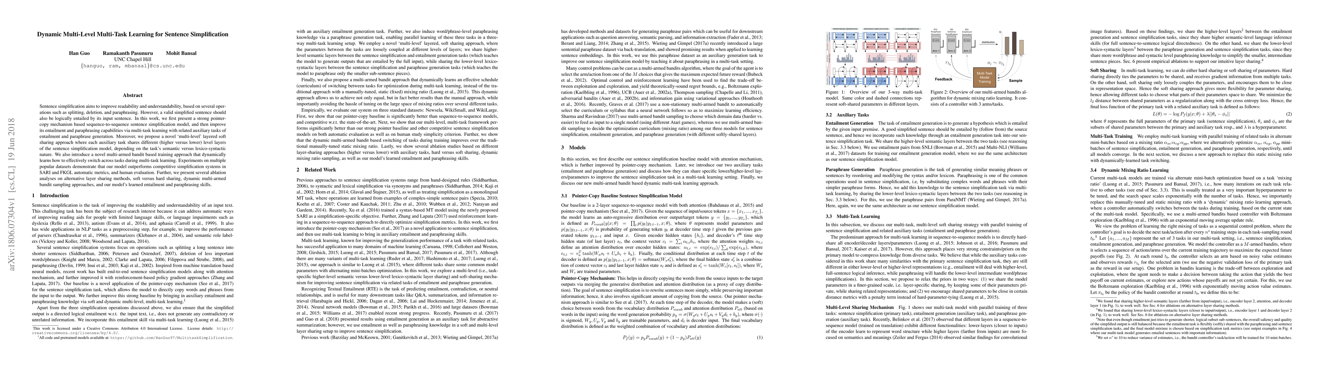 This paper presents a multi-level multi-task learning model for sentence simplification, improving entailment and paraphrasing through auxiliary tasks. The model dynamically switches tasks using a multi-armed bandit approach, achieving better results in readability metrics and human evaluations compared to existing methods.