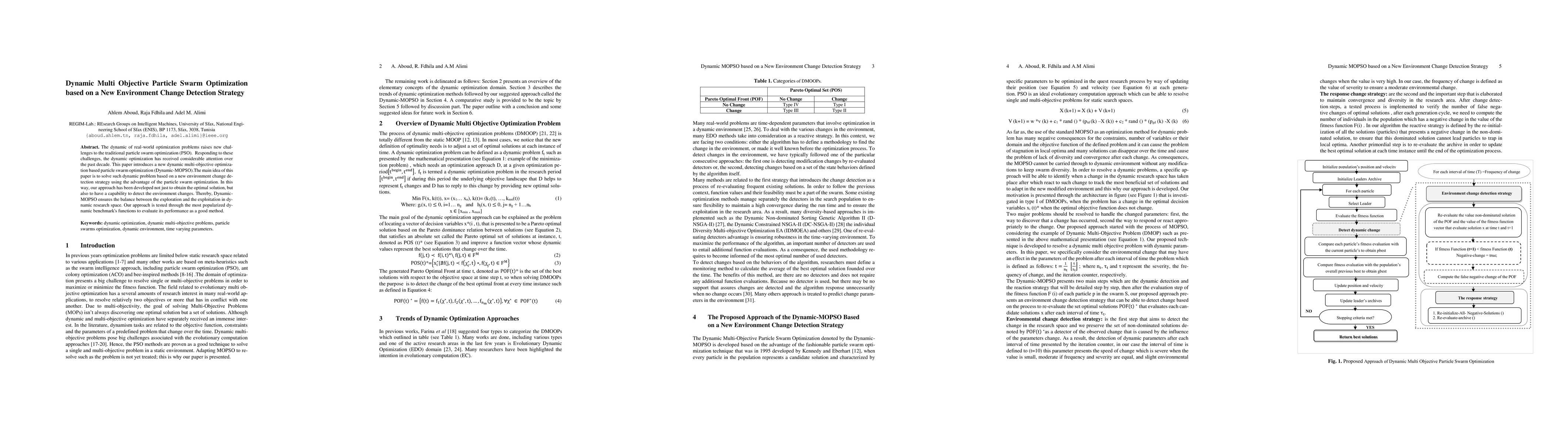 This paper proposes a Dynamic Multi Objective Particle Swarm Optimization (Dynamic-MOPSO) method that incorporates a new environment change detection strategy to address dynamic optimization challenges. The approach aims to balance exploration and exploitation in dynamic environments, ensuring optimal solution adaptation and performance evaluation through popular dynamic benchmark functions.
