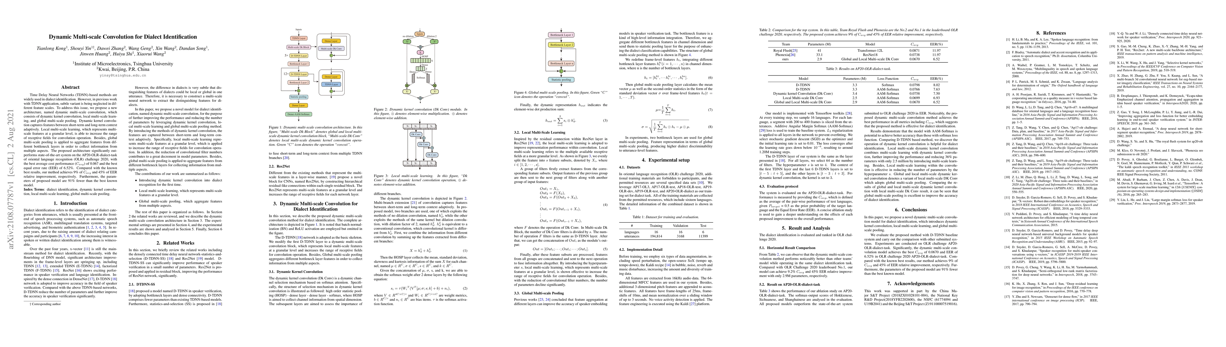Time Delay Neural Networks (TDNN)-based methods are widely used in dialect identification. However, in previous work with TDNN application, subtle variant is being neglected in different feature scales. To address this issue, we propose a new architecture, named dynamic multi-scale convolution, which consists of dynamic kernel convolution, local multi-scale learning, and global multi-scale pooling. Dynamic kernel convolution captures features between short-term and long-term context adaptively. Local multi-scale learning, which represents multi-scale features at a granular level, is able to increase the range of receptive fields for convolution operation. Besides, global multi-scale pooling is applied to aggregate features from different bottleneck layers in order to collect information from multiple aspects. The proposed architecture significantly outperforms state-of-the-art system on the AP20-OLR-dialect-task of oriental language recognition (OLR) challenge 2020, with the best average cost performance (Cavg) of 0.067 and the best equal error rate (EER) of 6.52%. Compared with the known best results, our method achieves 9% of Cavg and 45% of EER relative improvement, respectively. Furthermore, the parameters of proposed model are 91% fewer than the best known model.