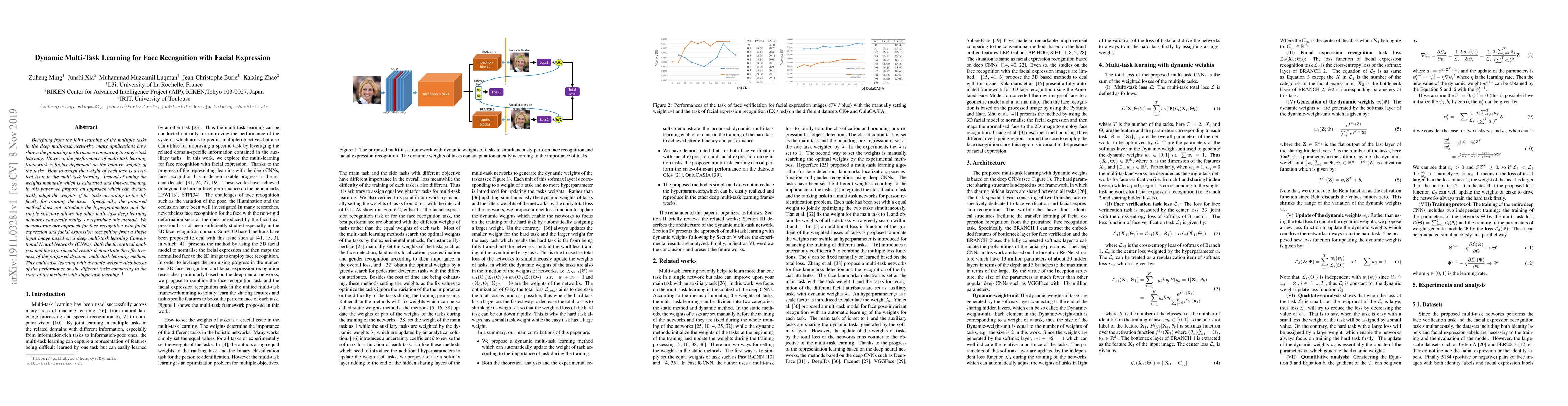 This paper proposes a dynamic multi-task learning approach for face recognition and facial expression recognition, which adaptively adjusts task weights based on training difficulty, eliminating the need for manual tuning. The method enhances performance over single-task learning and outperforms state-of-the-art methods.