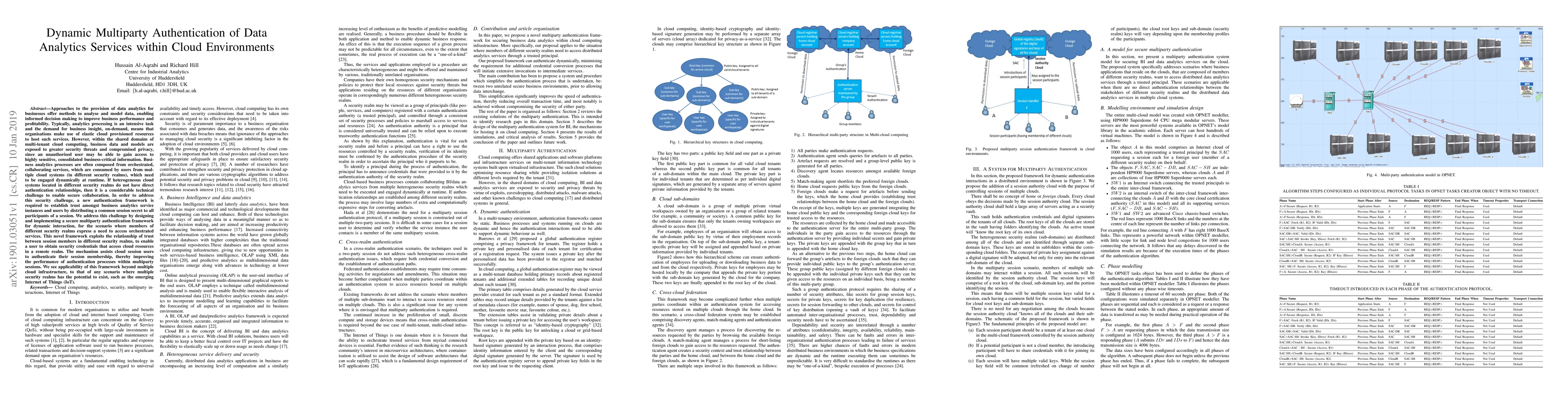 Business analytics processes are often composed from orchestrated, collaborating services, which are consumed by users from multiple cloud systems (in different security realms), which need to be engaged dynamically at runtime. If heterogeneous cloud systems located in different security realms do not have direct authentication relationships, then it is a considerable technical challenge to enable secure collaboration. In order to address this security challenge, a new authentication framework is required to establish trust amongst business analytics service instances and users by distributing a common session secret to all participants of a session. We address this challenge by designing and implementing a secure multiparty authentication framework for dynamic interaction, for the scenario where members of different security realms express a need to access orchestrated services. This novel framework exploits the relationship of trust between session members in different security realms, to enable a user to obtain security credentials that access cloud resources in a remote realm. The mechanism assists cloud session users to authenticate their session membership, thereby improving the performance of authentication processes within multiparty sessions. We see applicability of this framework beyond multiple cloud infrastructure, to that of any scenario where multiple security realms has the potential to exist, such as the emerging Internet of Things (IoT).