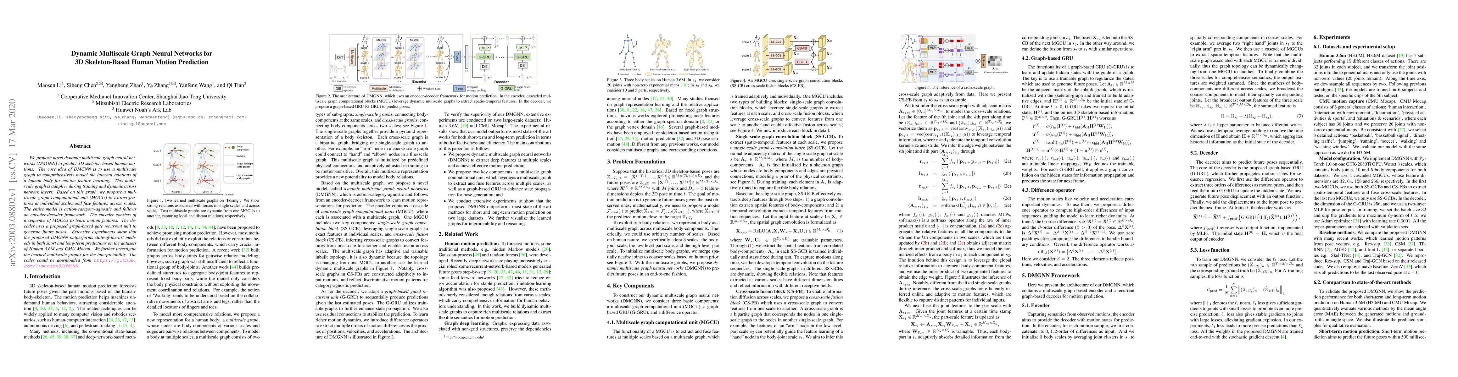 The paper proposes dynamic multiscale graph neural networks (DMGNN) for predicting 3D skeleton-based human motions, utilizing a multiscale graph to model internal body relations and a multiscale graph computational unit to extract and fuse features. The model outperforms existing methods in both short and long-term predictions on benchmark datasets.
