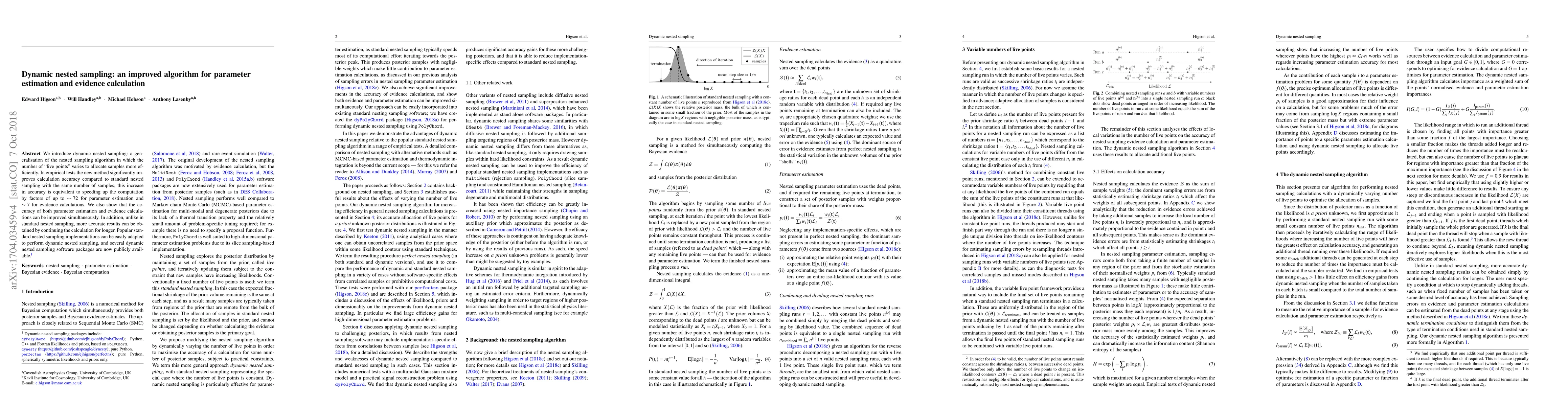 Dynamic nested sampling improves parameter estimation and evidence calculation efficiency by dynamically adjusting the number of live points, achieving up to 72x faster computation for parameter estimation and 7x for evidence calculations compared to standard nested sampling. This method allows for simultaneous improvements in both accuracy and computational speed.