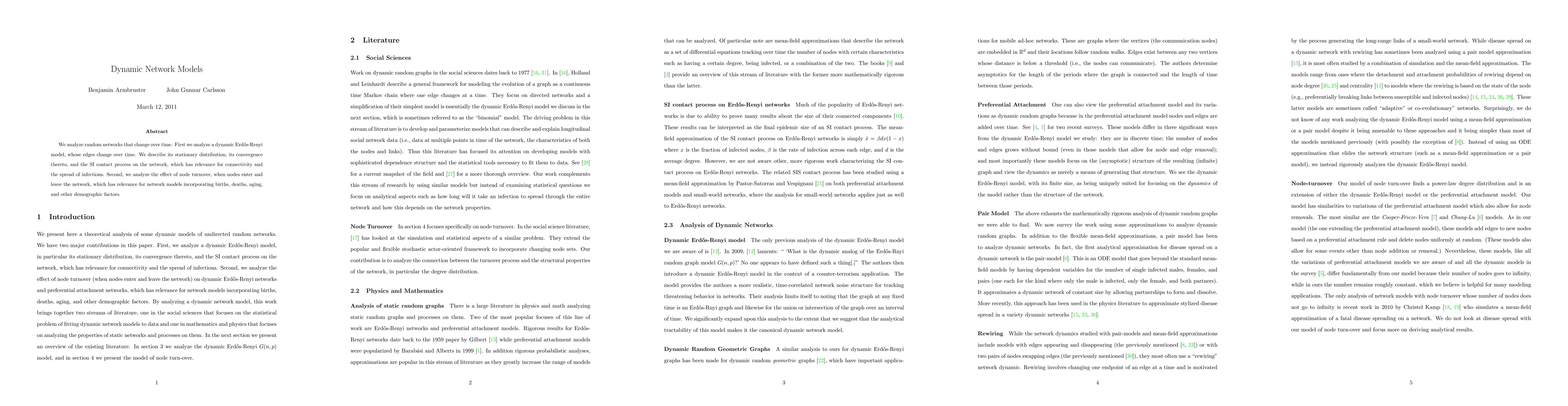 We analyze random networks that change over time. First we analyze a dynamic Erdos-Renyi model, whose edges change over time. We describe its stationary distribution, its convergence thereto, and the SI contact process on the network, which has relevance for connectivity and the spread of infections. Second, we analyze the effect of node turnover, when nodes enter and leave the network, which has relevance for network models incorporating births, deaths, aging, and other demographic factors.