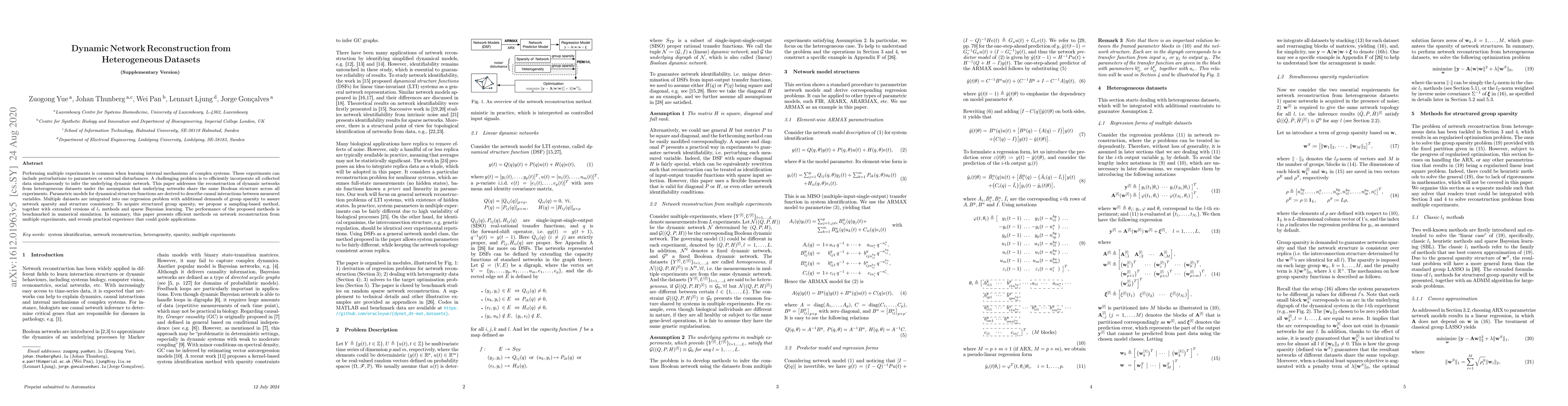 Performing multiple experiments is common when learning internal mechanisms of complex systems. These experiments can include perturbations to parameters or external disturbances. A challenging problem is to efficiently incorporate all collected data simultaneously to infer the underlying dynamic network. This paper addresses the reconstruction of dynamic networks from heterogeneous datasets under the assumption that underlying networks share the same Boolean structure across all experiments. Parametric models for dynamical structure functions are derived to describe causal interactions between measured variables. Multiple datasets are integrated into one regression problem with additional demands of group sparsity to assure network sparsity and structure consistency. To acquire structured group sparsity, we propose a sampling-based method, together with extended versions of l1 methods and sparse Bayesian learning. The performance of the proposed methods is benchmarked in numerical simulation. In summary, this paper presents efficient methods on network reconstruction from multiple experiments, and reveals practical experience that could guide applications.